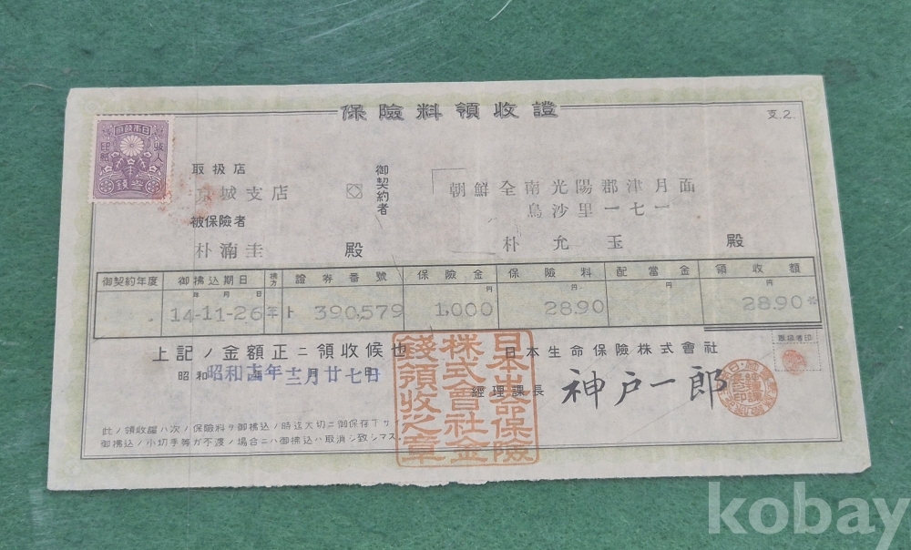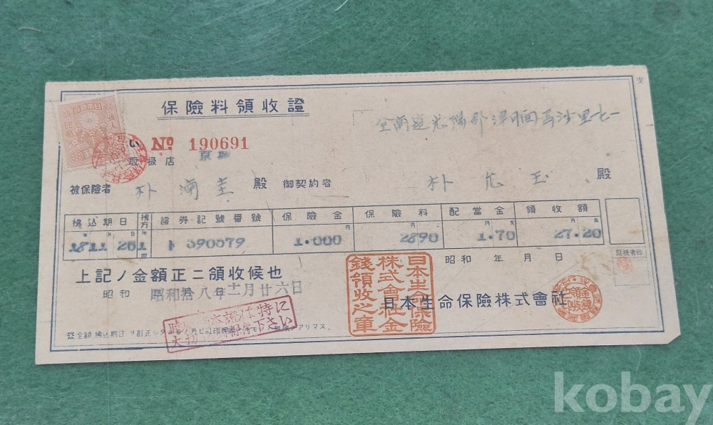 1]. 품명 : 保險料領收證 2枚