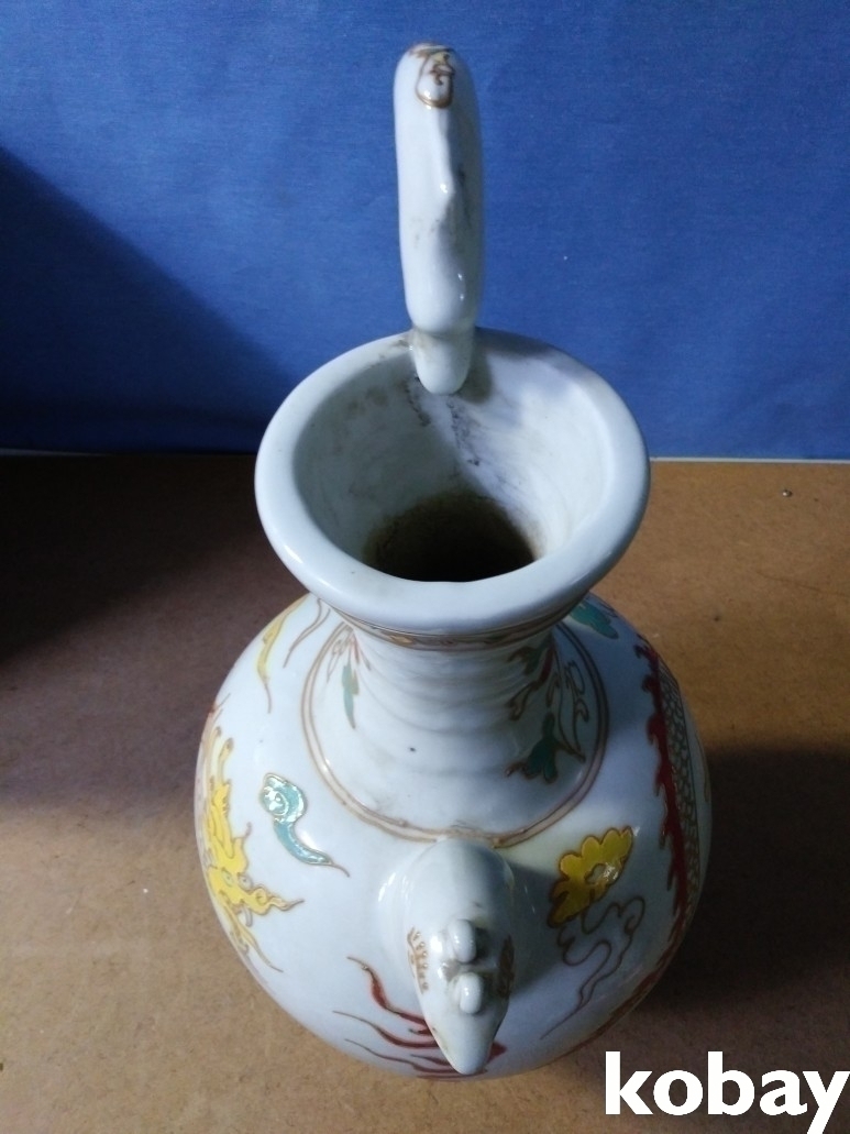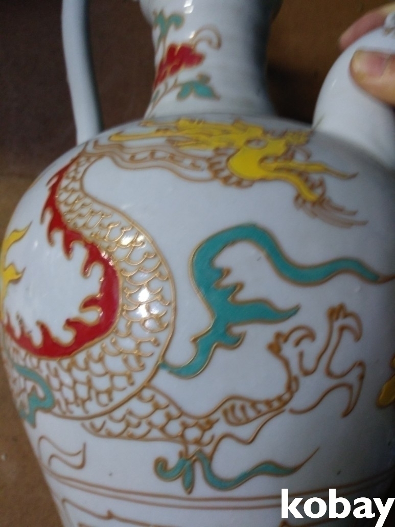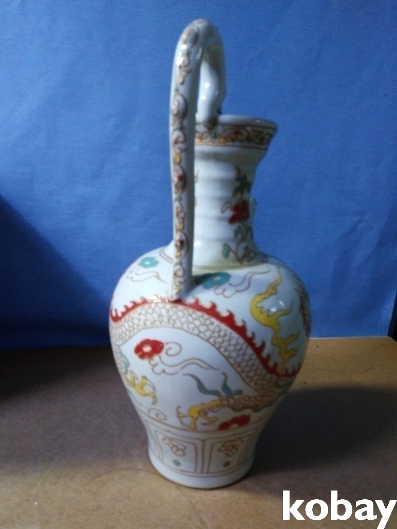 용 문양에 용 손잡이가 있는 주전자 도자기 입니다.
