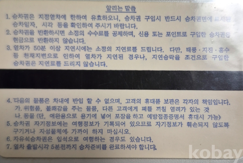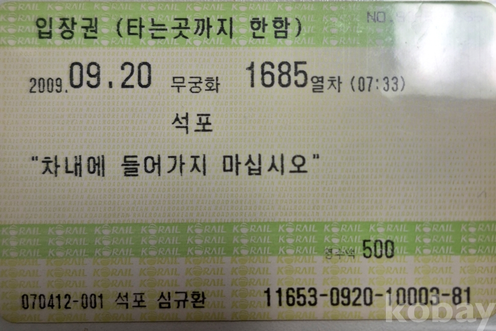 2009년 11월 30일 이전에 발행된 철도 MS(마그네틱) 단말기 석포역 입장권입니다.