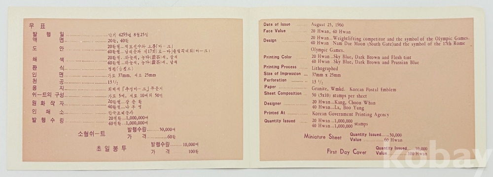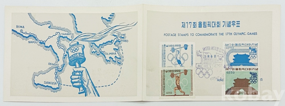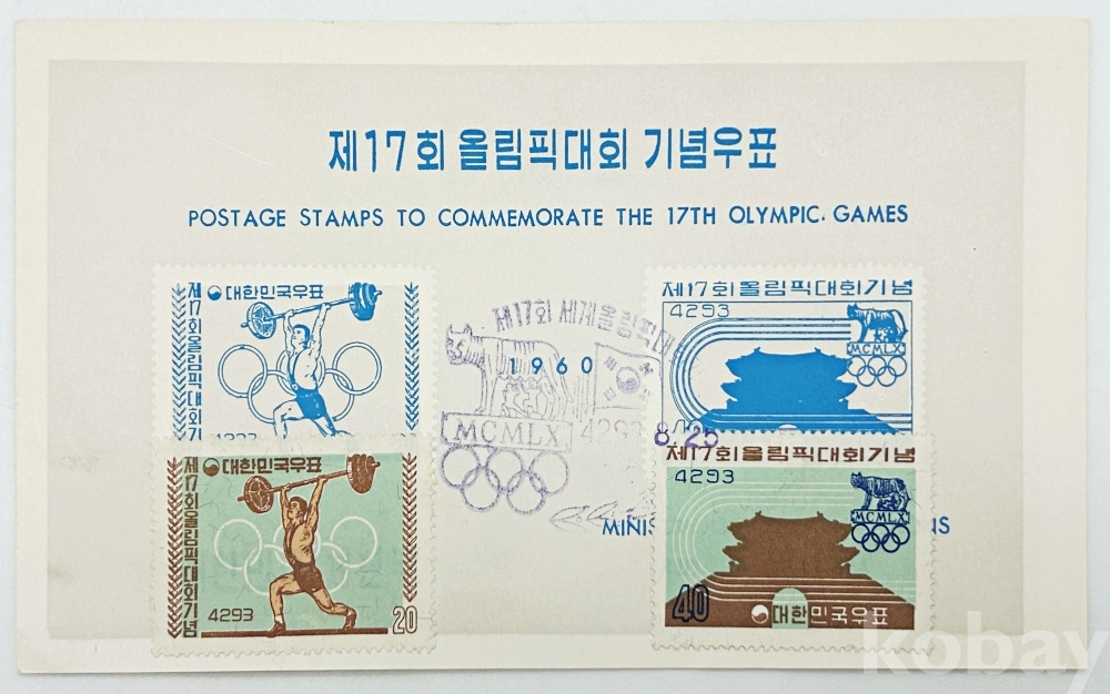 상품 설명 | 1960년 8월 25일 제17회 올림픽대회를 기념하여 발행된 기념 우표 안내카드이다. 액면가 20환 2매, 40환 2매, 총 4종의 우표가 부착되어있다. | ||