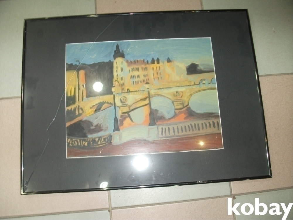옛성터 건물과 상상배치된 톡특한 색상의 수준높은 반비구상 유화그림 가로세로 62 x 46 cm