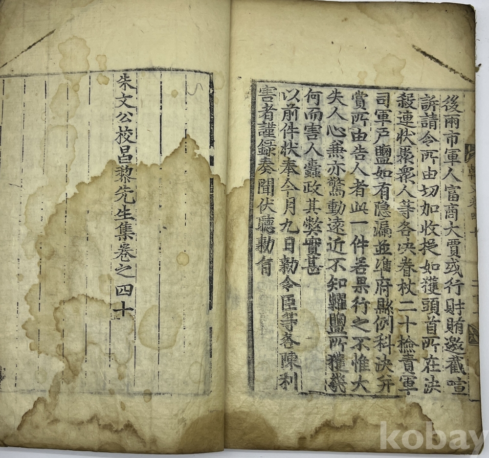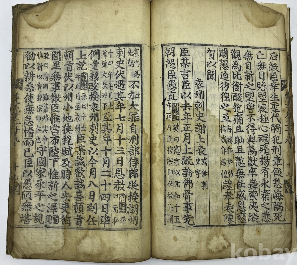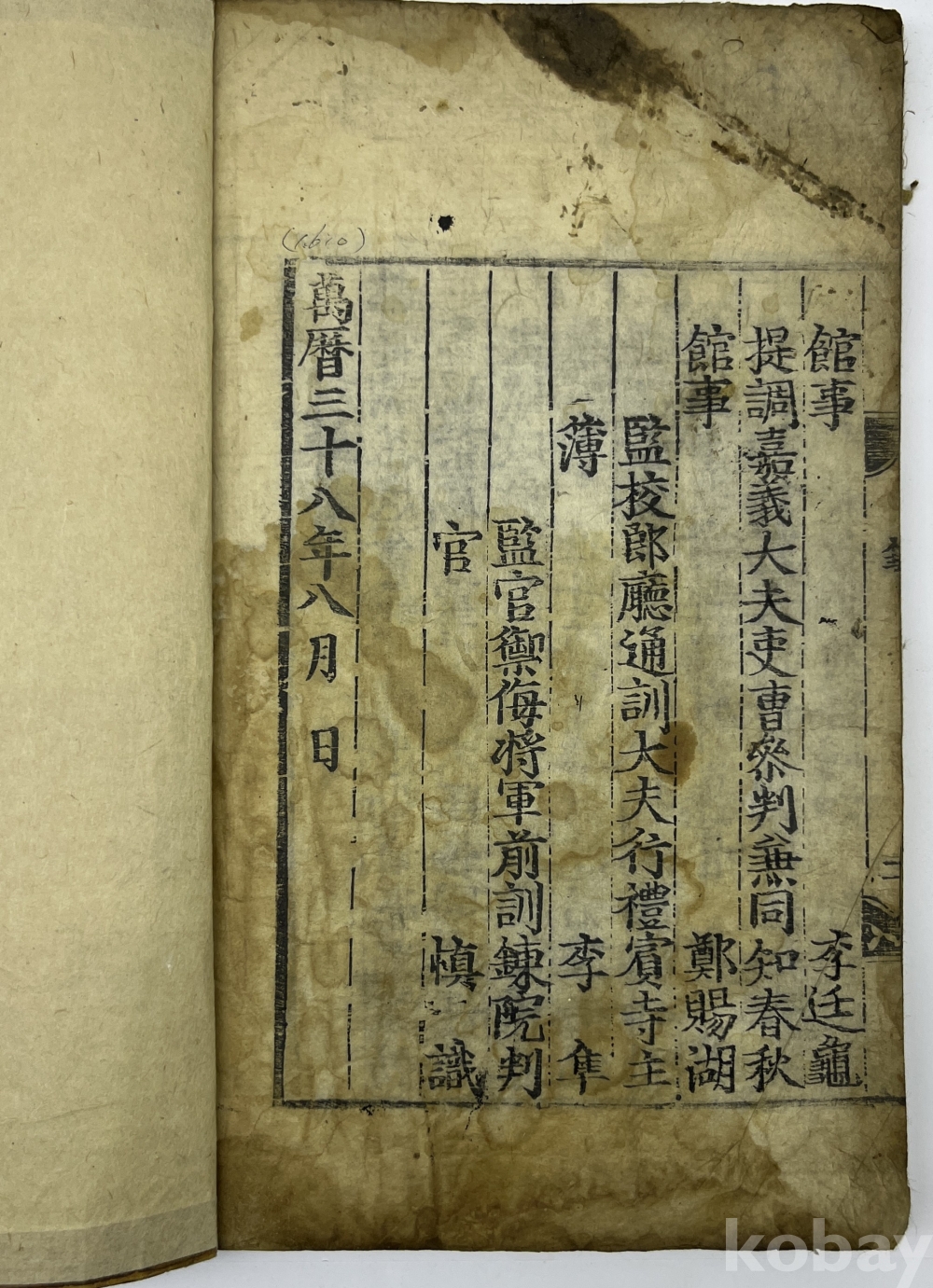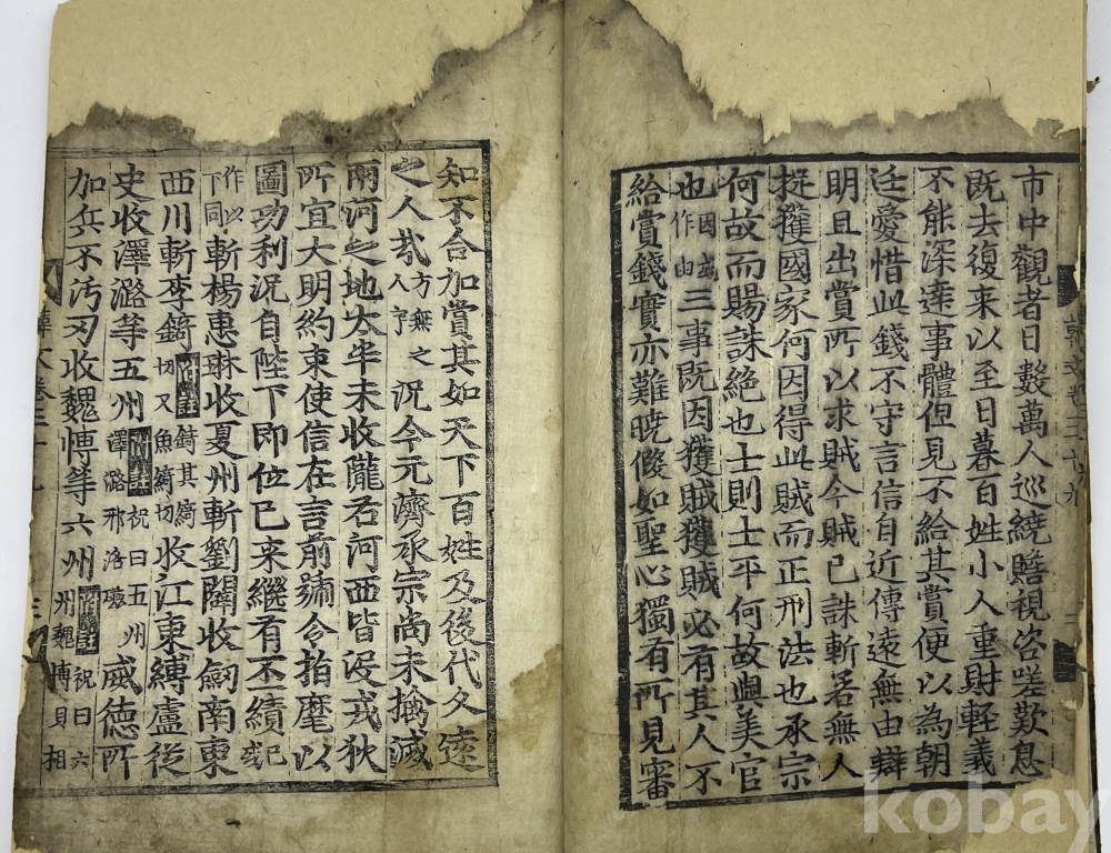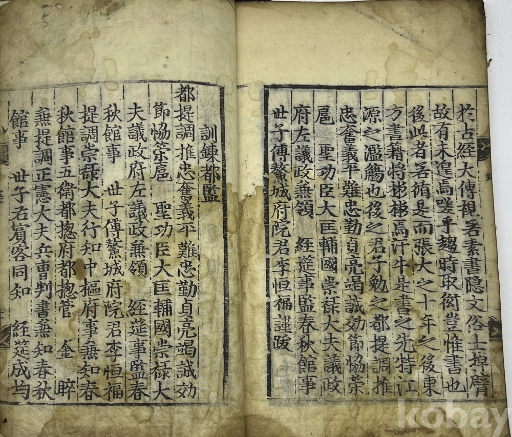 설 명 | 40권이 끝난 후 오성부원군 이항복의 발문과 훈련도감의 구성원 명단, 간기가 있다. 이항복의 발문에서는 둔전(屯田) 폐지후 책을 찍어낸 것은 모두 남쪽의 군수물자를 위함이라고 하고, 후에 안평대군의 인본(印本) 수권을 얻어 다시 새겨 만들었더니 활자가 둥글고 굴러가는 듯 하여 벼슬아치들이 좋아하였고 많은 이익으로 관료와 장인들의 봉급을 이에 의지하게 되었다고 한다. 다만 돈이 되는 과거시험용 책자들에 치우친 것이 아쉬움에도 불구하고 이 사업을 계속 확장한다면 10년 뒤에는 우리나라의 서적들이 풍성하게 갖춰질 것이다라고 하였다. 간기에는 훈련도감의 수뇌부로 도제조 오성부원군 이항복, 제조(提調)는 오위도총부도총관 김수(金睟), 겸제조(兼提調)는 경연성균관사(經筵成均館事) 이정구(李廷龜) 등의 이름과, ‘萬曆三十八年八月日’ 간행년대가 보인다. 단, 본 물품은 경오자체훈감자의 번각본이다. 서두 7장의 배접 보사했으며, 곳곳에 얼룩에 있으나 낙장은 없다. | |||||