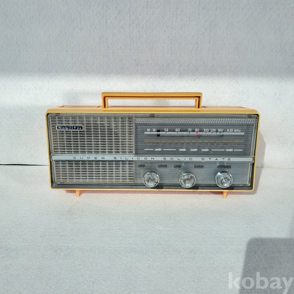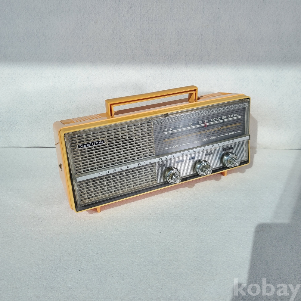 전면 스피커 그릴에 당당하게 부착된 'Nobility(노빌리티)'라는 브랜드 마크는 이 제품이 지닌 각별한 정체성을 대변합니다. 자체 브랜드 수출이 쉽지 않았던 시절, 뛰어난 기술력을 인정받아 전략적인 수출용 브랜드로 태평양을 건넜던 우리 가전의 땀방울이 서려 있습니다. 섬세한 스티치(바느질) 형태의 마감 처리는 당시 서구권 소비자들의 취향을 맞추기 위해 고심했던 60~70년대 특유의 클래식하고 우아한 산업 디자인의 정수를 보여줍니다.