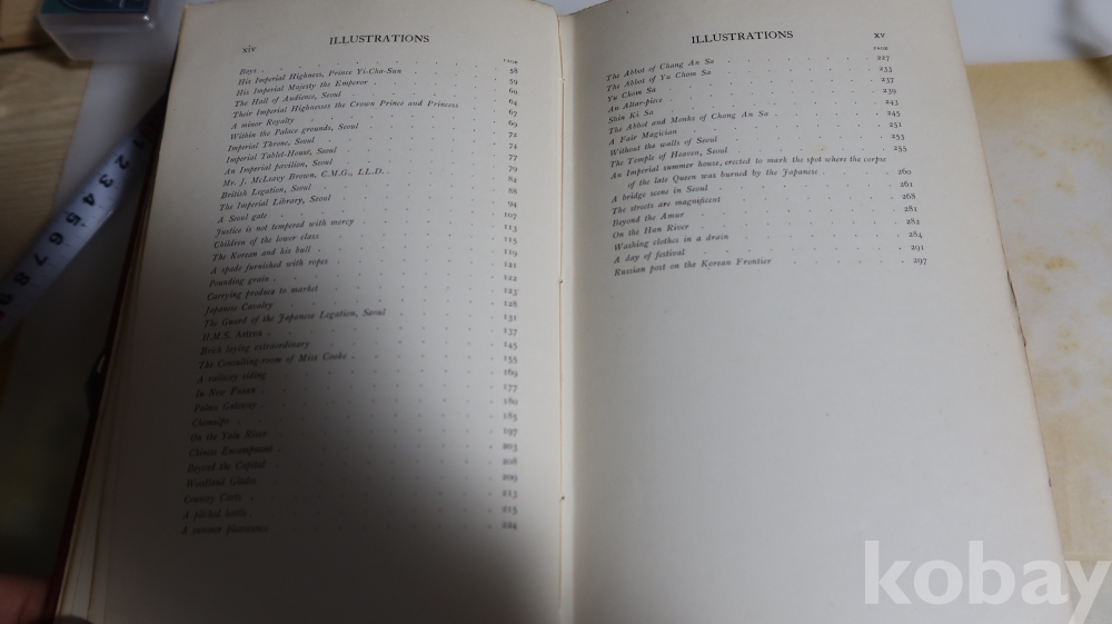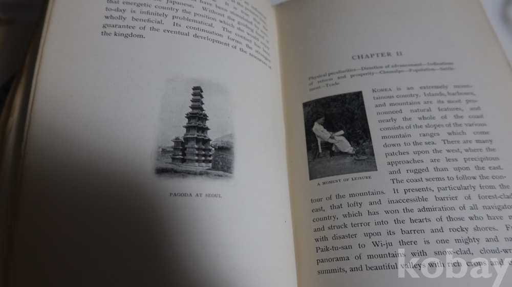 1904년 영국에서 발행 된 하드 카바 이며 309페이지에 걸쳐 수많은 귀한 사진을 가진 초판본의 구한말 조선 사진을 가진 명저 임니다 세월의 반점 등이 보이는 117년전 낙장없는 명물 워낙 귀한 사진을 가진 명저
