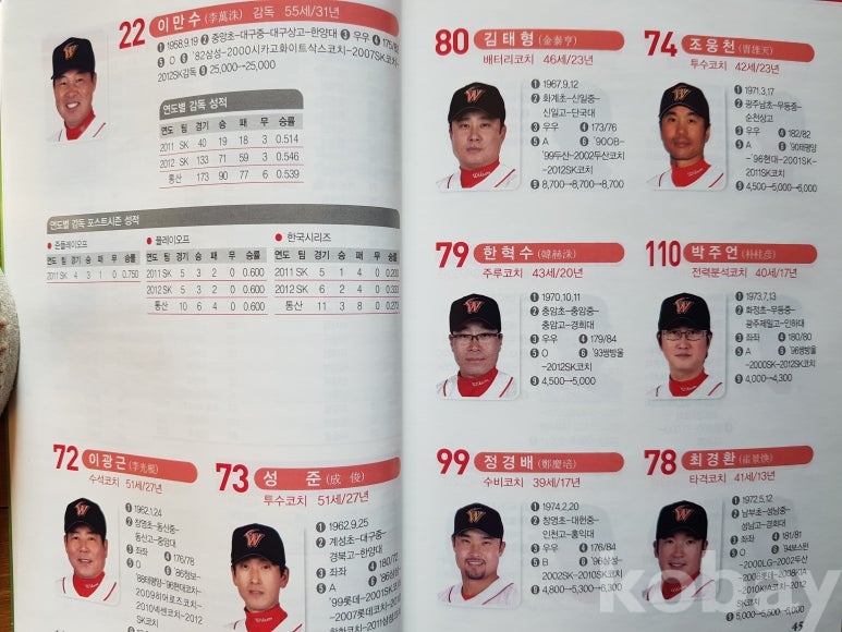한국야구위원회 발행 야구 수집가라면 이 한권의 책으로 모든 선수 소속 8구단과 신상 기록을 알수 있어 야구자료 수집에 많은 도움이 될것입니다.
