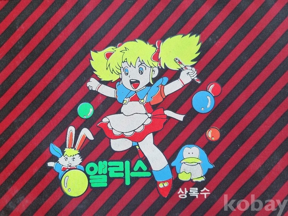 1. 앨리스 버전: 앨리스와 토끼, 펭귄 캐릭터가 그려진 스트라이프 디자인.