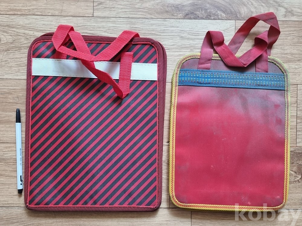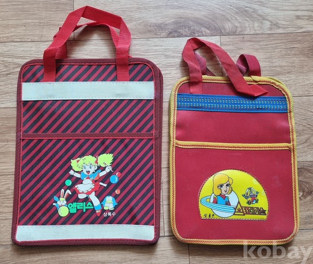 1980~90년대 초등학교 교실의 필수품이었던 '상록수' 브랜드 실내화 가방 2점입니다.