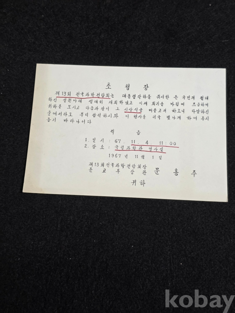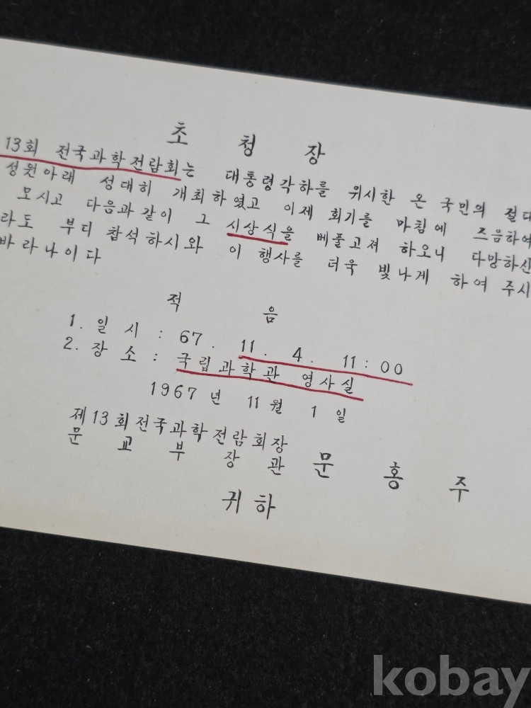 (((근현대사자료))) 1967년 제13회 전국과학전람회장 문교부장관 문홍주 초청장