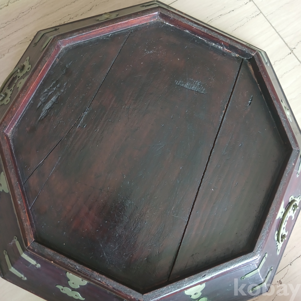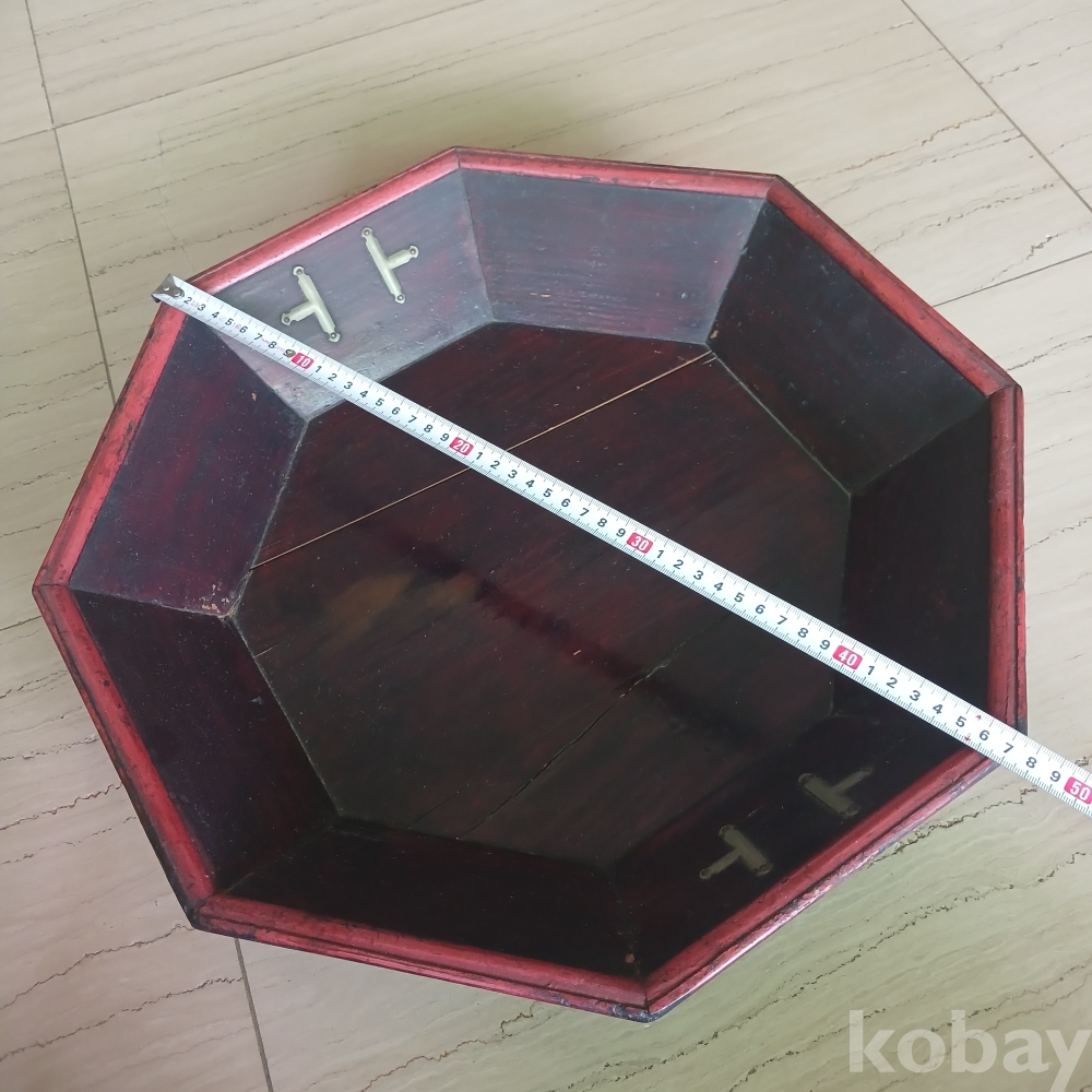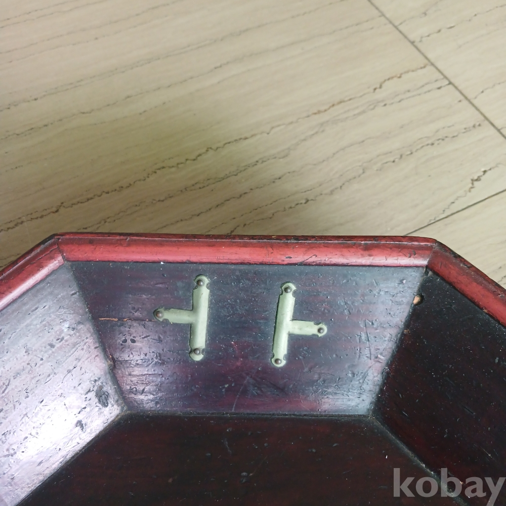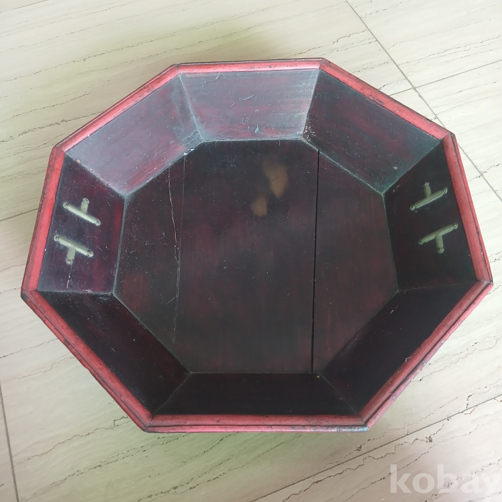 화려한 백동장식에 주칠과 옻칠이 아름다은 8각 함지입니다 당호 고급으로 제작된 목기입니디ㅡ바닥 판재는 쪽판입니다ㆍ 상태 좋습니다 강점기 년대로 사료됨니다