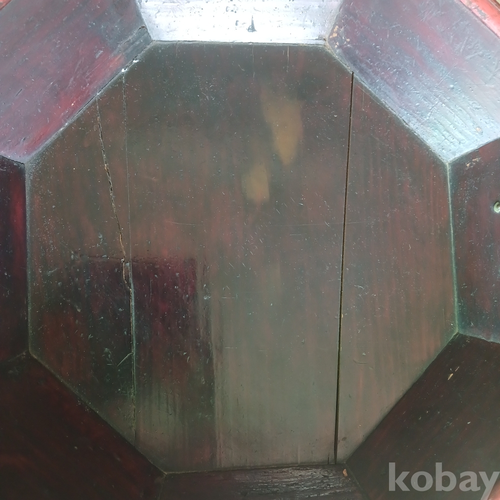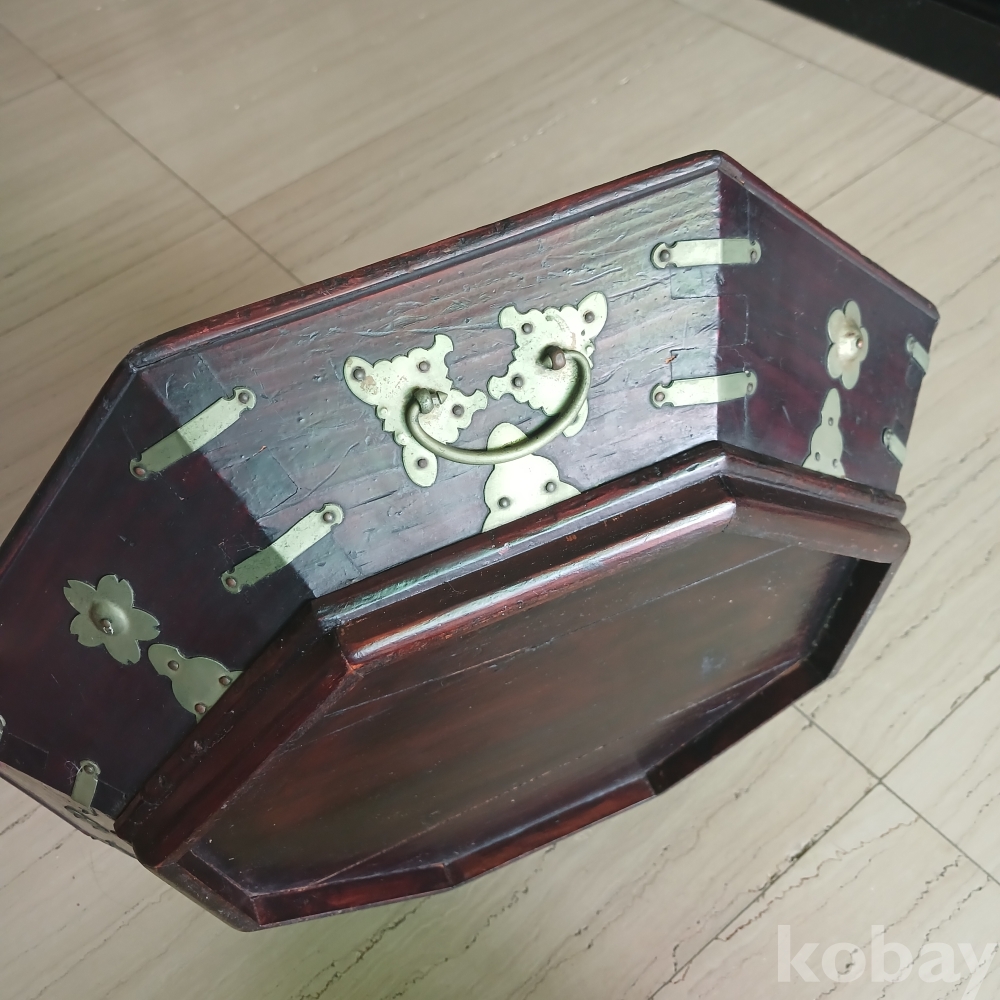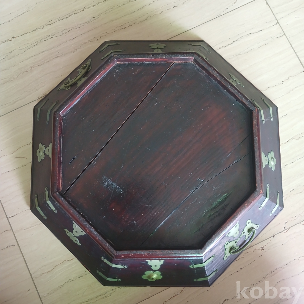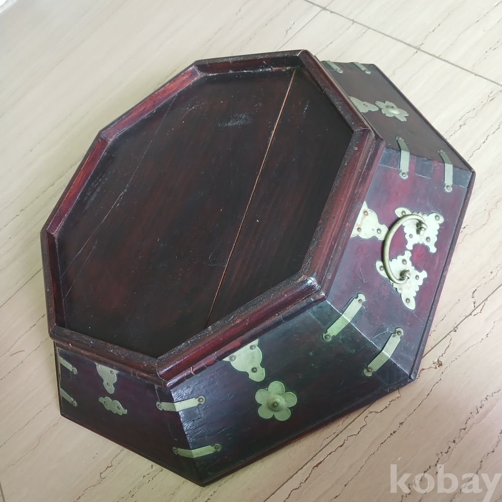 화려한 백동장식에 주칠과 옻칠이 아름다은 8각 함지입니다 당호 고급으로 제작된 목기입니디ㅡ바닥 판재는 쪽판입니다ㆍ 상태 좋습니다 강점기 년대로 사료됨니다