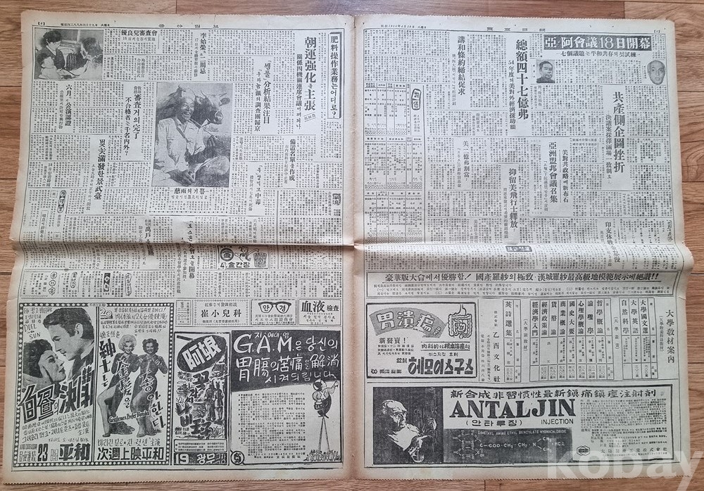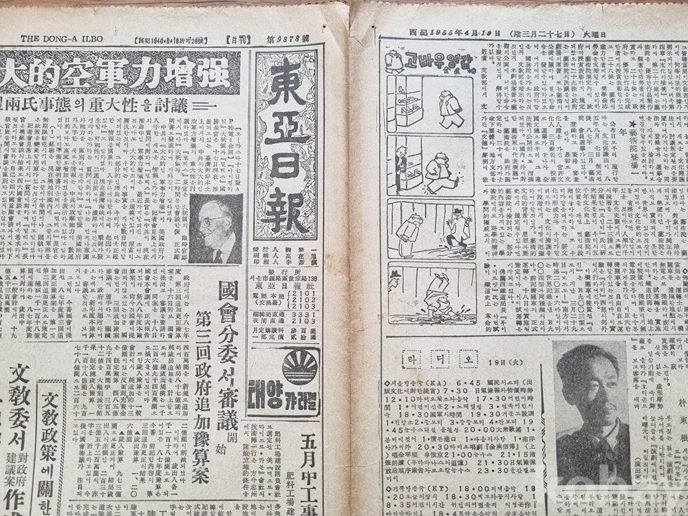 "1955년의 긴박한 정세와 대중문화가 공존하는 4월 19일자 동아일보 원본입니다."