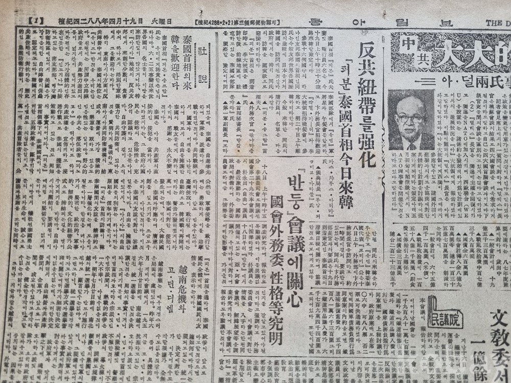 1면을 장식한 태국 수상 내한 소식과 중공 공군력 증강 기사는