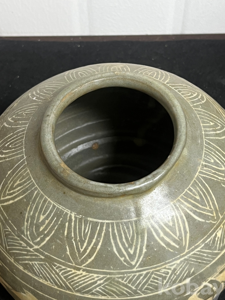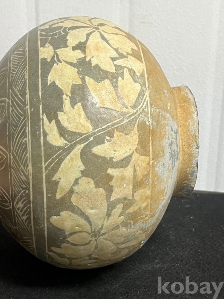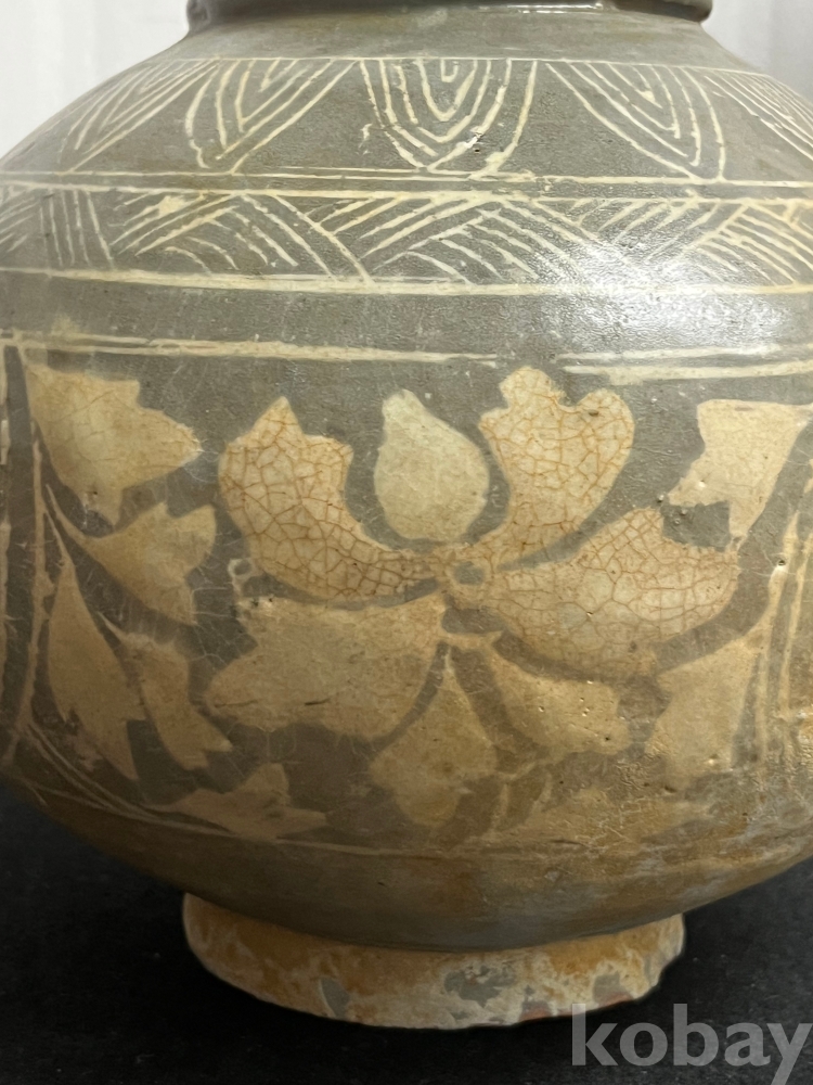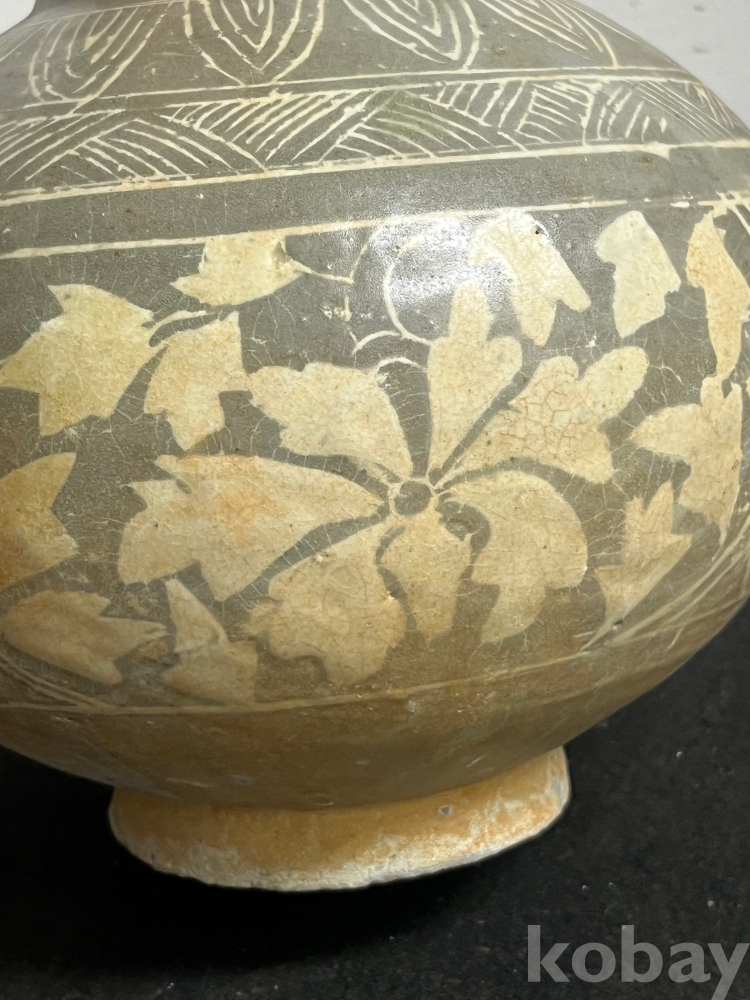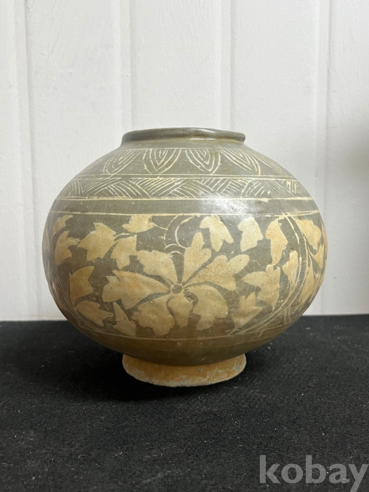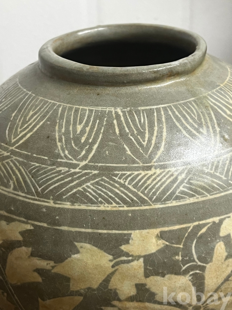 회청색 바탕위에 백토를 메워 넣은 상감 기법으로