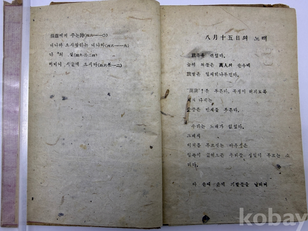 설 명 | 이 시집에 수록된 시들은 8.15 광복 이후에 쓰여진 작품들로 편성되어 있으며, 일자, 수록시편을 제작 순에 따라 배열하였다. 「8.15의 노래」, 「병든 서울」, 「가거라 벗이여」, 「내나라 오사랑하는 내나라」 등 8.15 직후 격변하는 혼란된 상황 의식이 담긴 총 19편의 작품이 수록되어 있다. 저자가 쓴 <머리에>가 담겨있다. | |||||