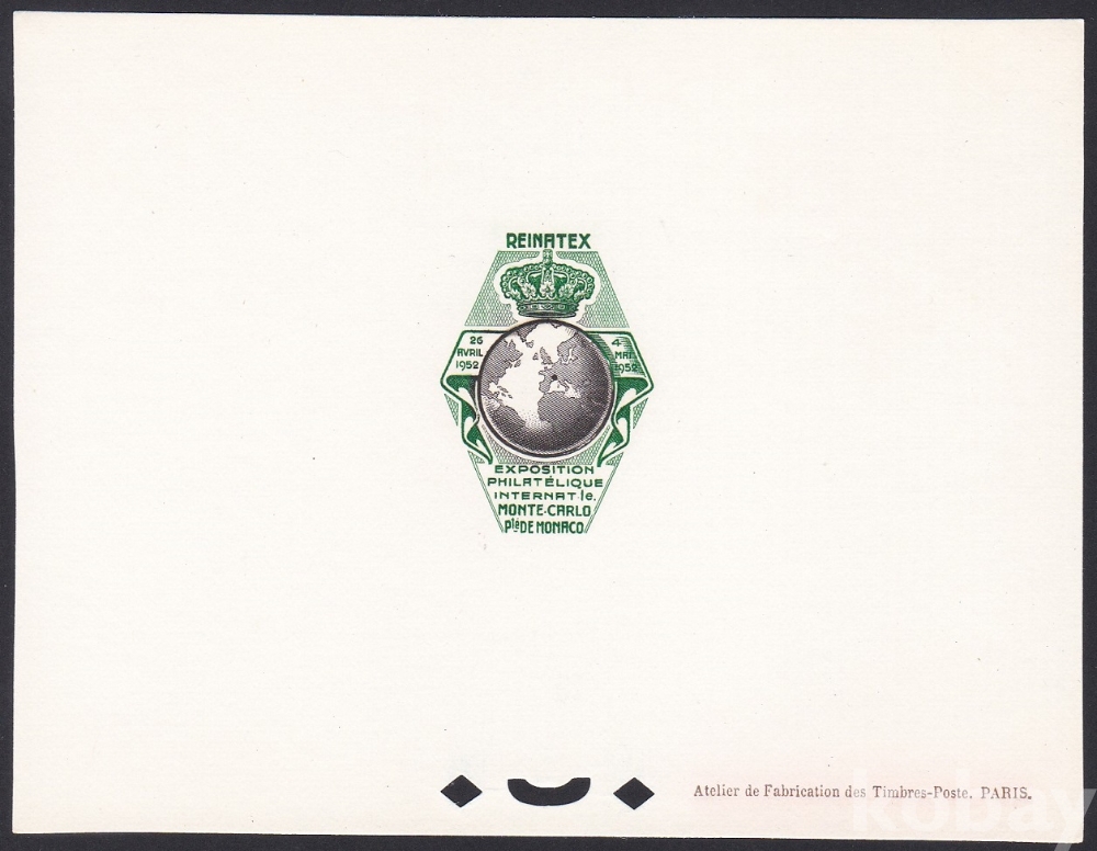 (하늘천) 모나코 1952년 REINATEX 우표전시회 비네트, 지구, 지도, 왕관, 디럭스 프루프 I