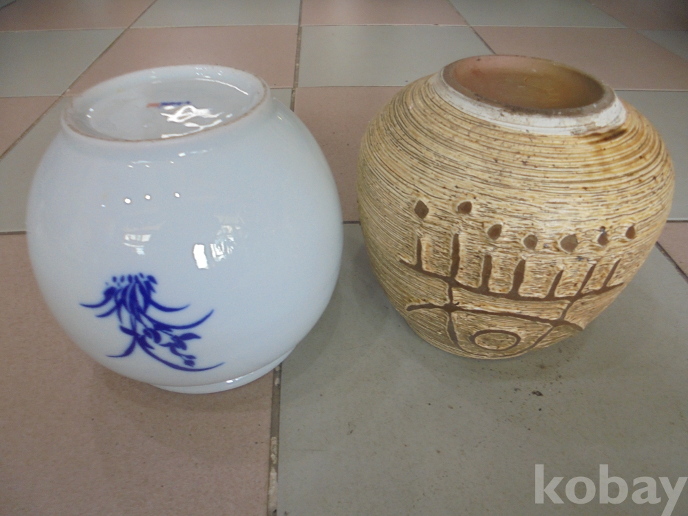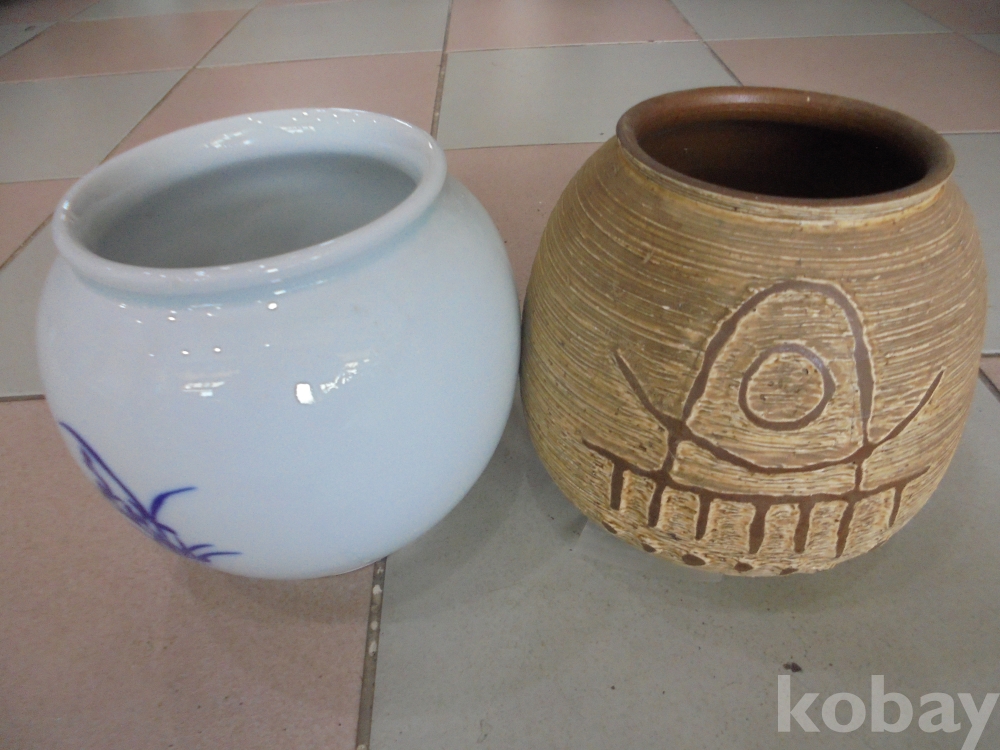 모양과 희안한그림과 한자들어간 순백자와 토기류같은 항아리 2점 백자 웟지름 13 cm 높이 16 cm 외사진참조
