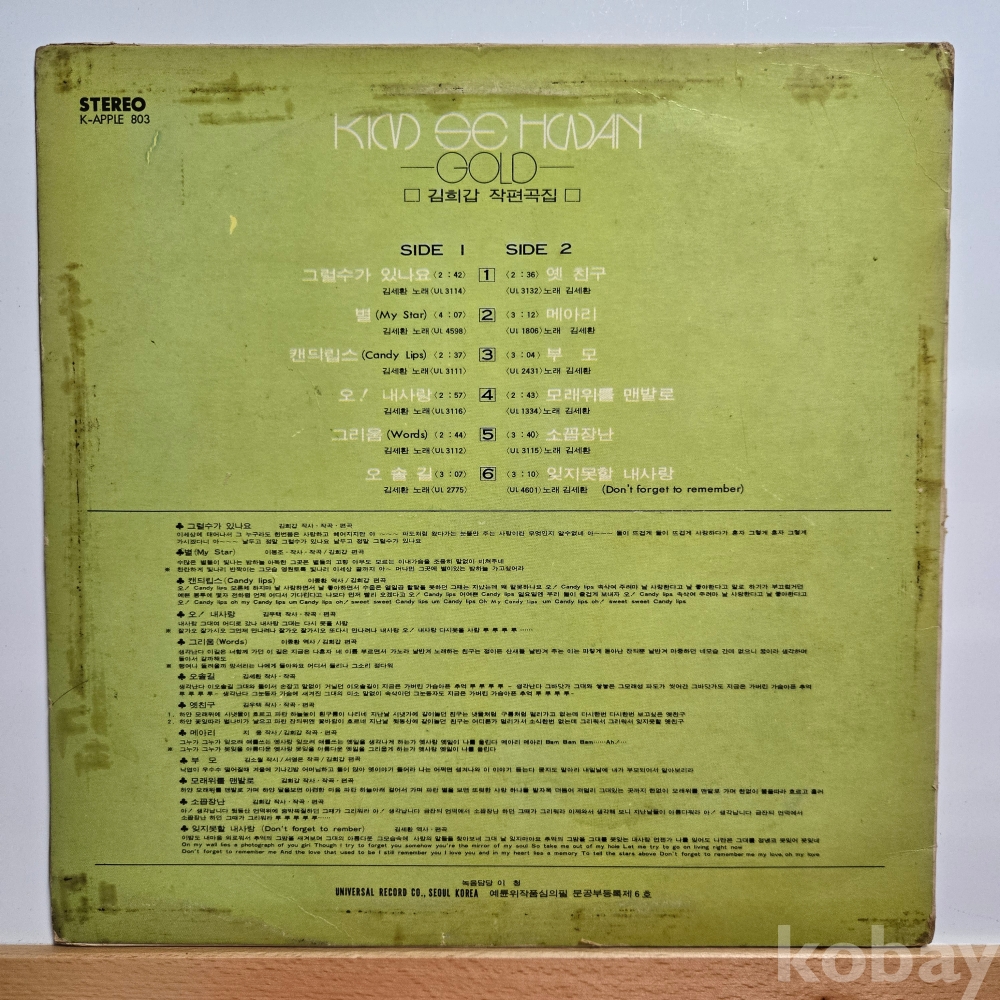 | 자켓상태 | VG : 주름, 접힘, 모서리 찢김 다수 | 음반상태 | EX : 재생에 영향 없는 가벼운 기스 존재 | 발매정보 | 초반 | 가사지여부 | 무 |