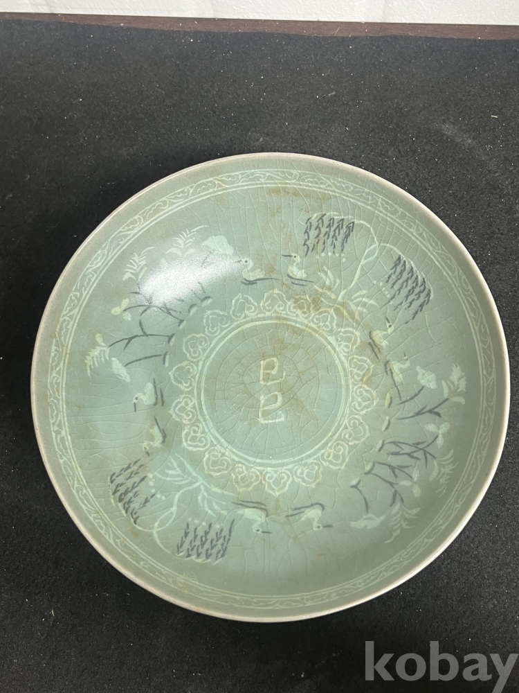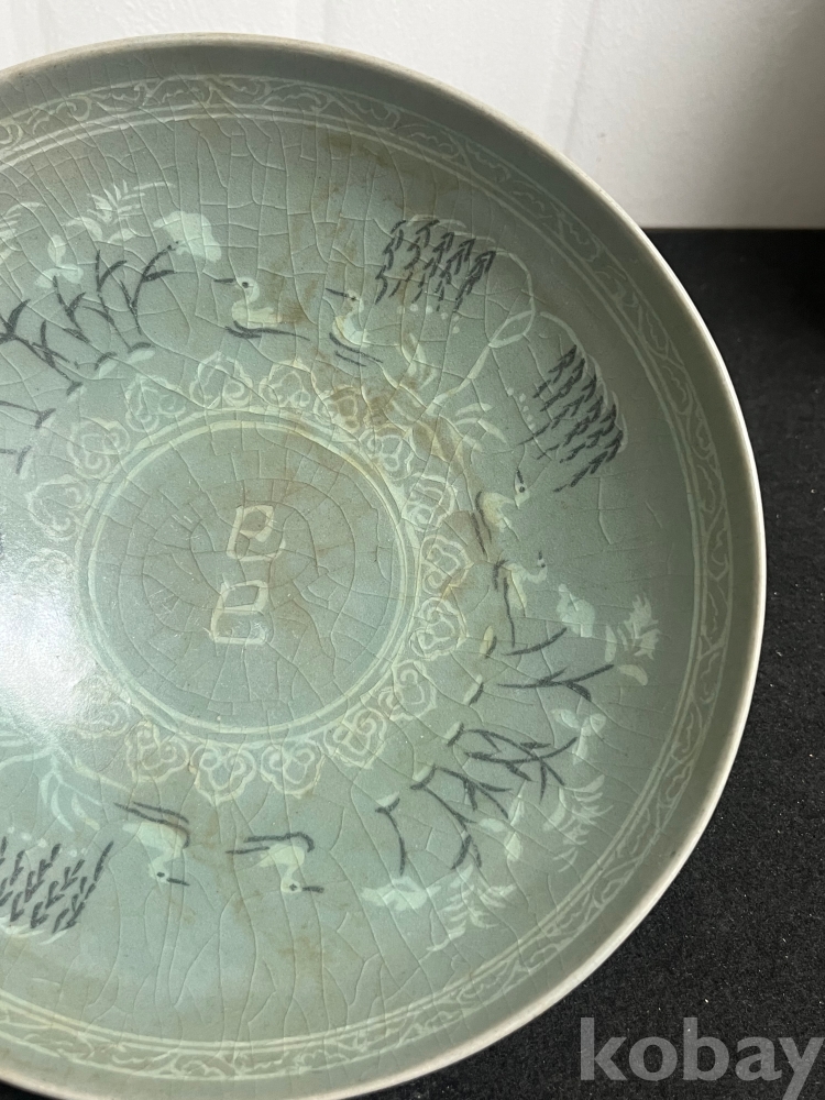 은은한 청자 유면 위에 상감 기법으로 화훼와 수금문을 배치하고,