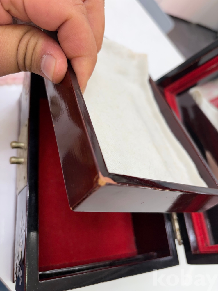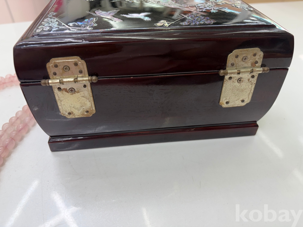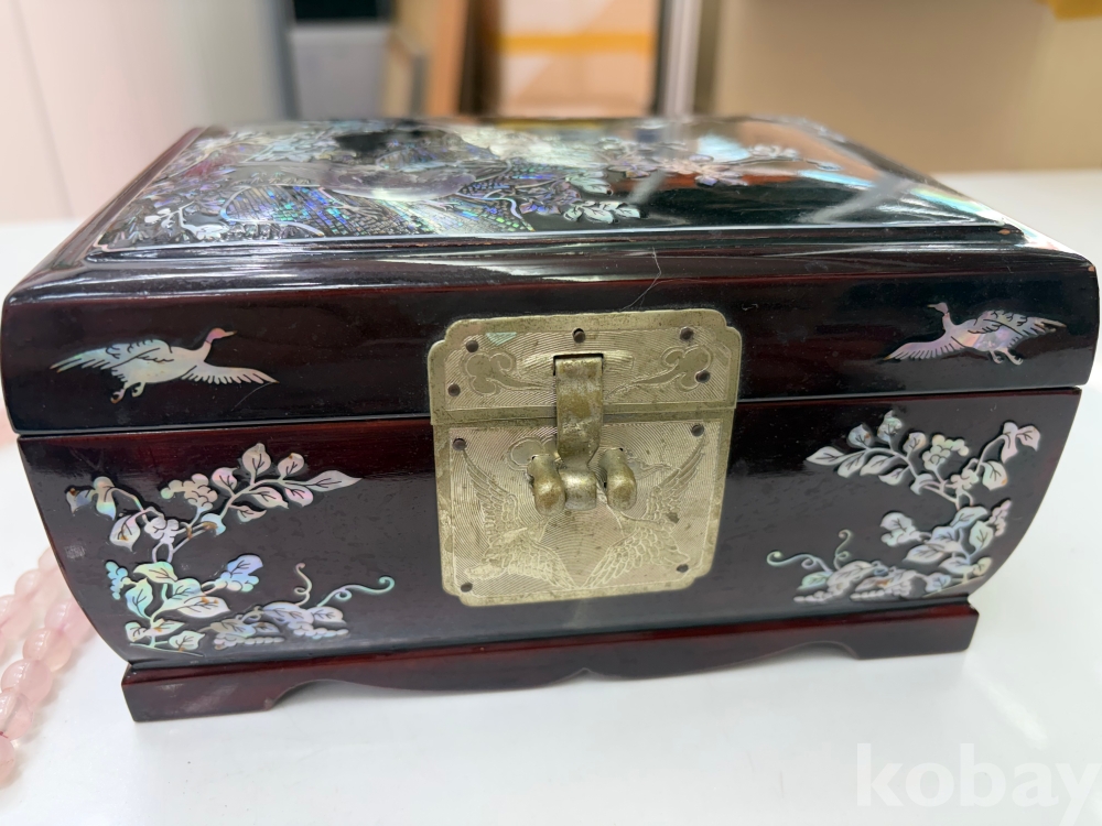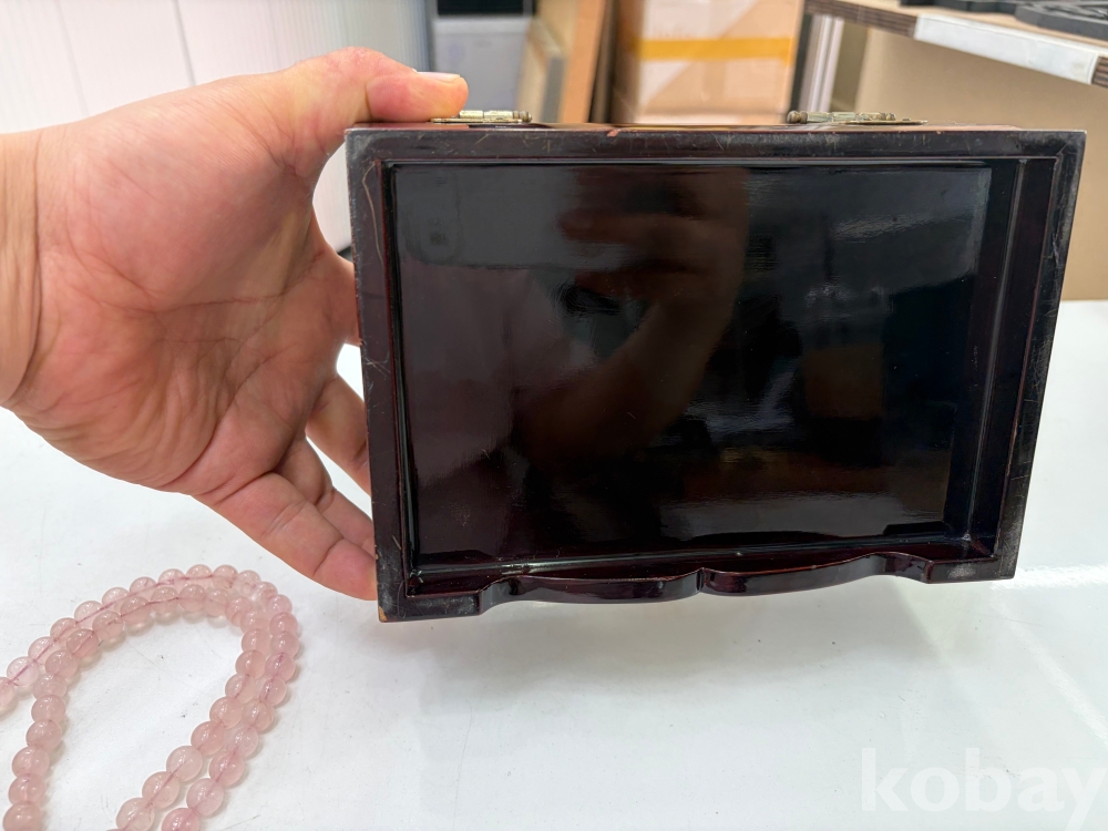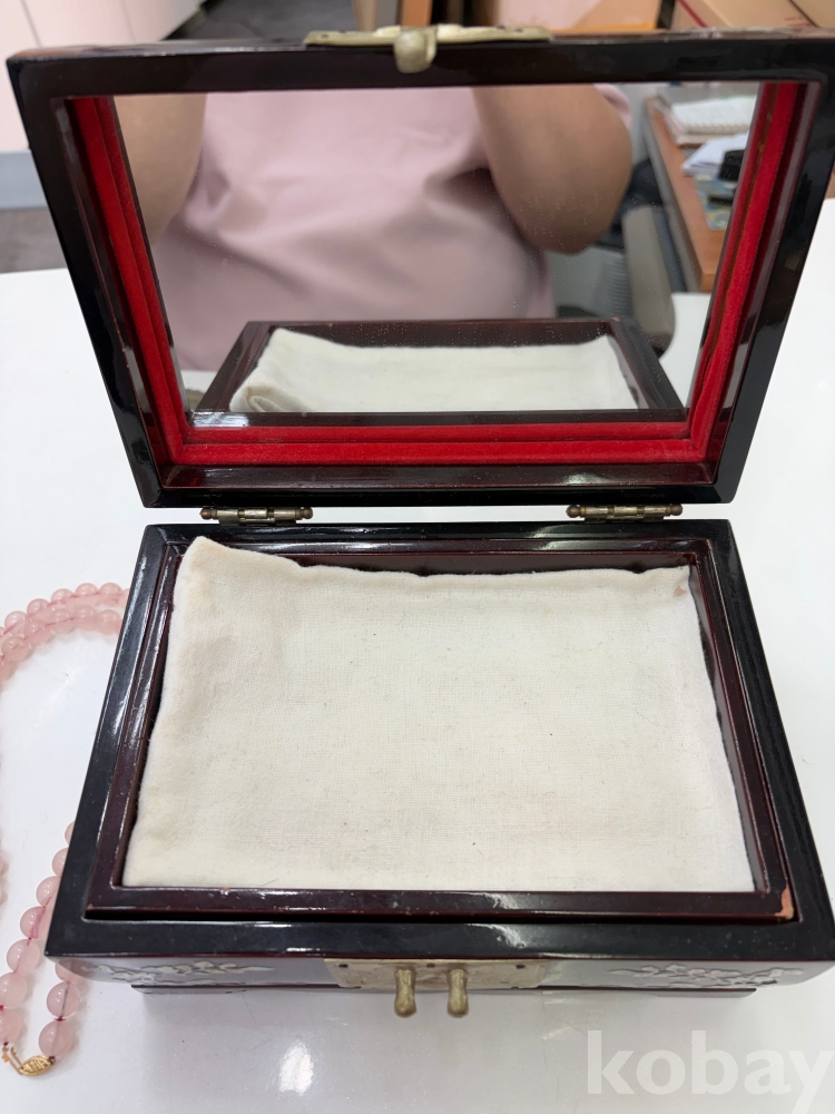 보석함 사이즈 19.5*13.5*10.5cm입니다 보석함 상단오른쪽 모서리 약간 까짐 안에 서랍 모서리 까짐 있습니다