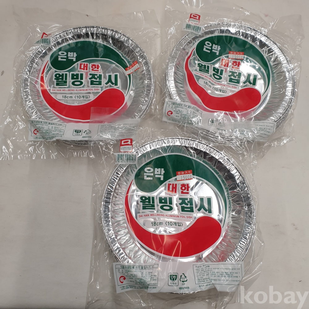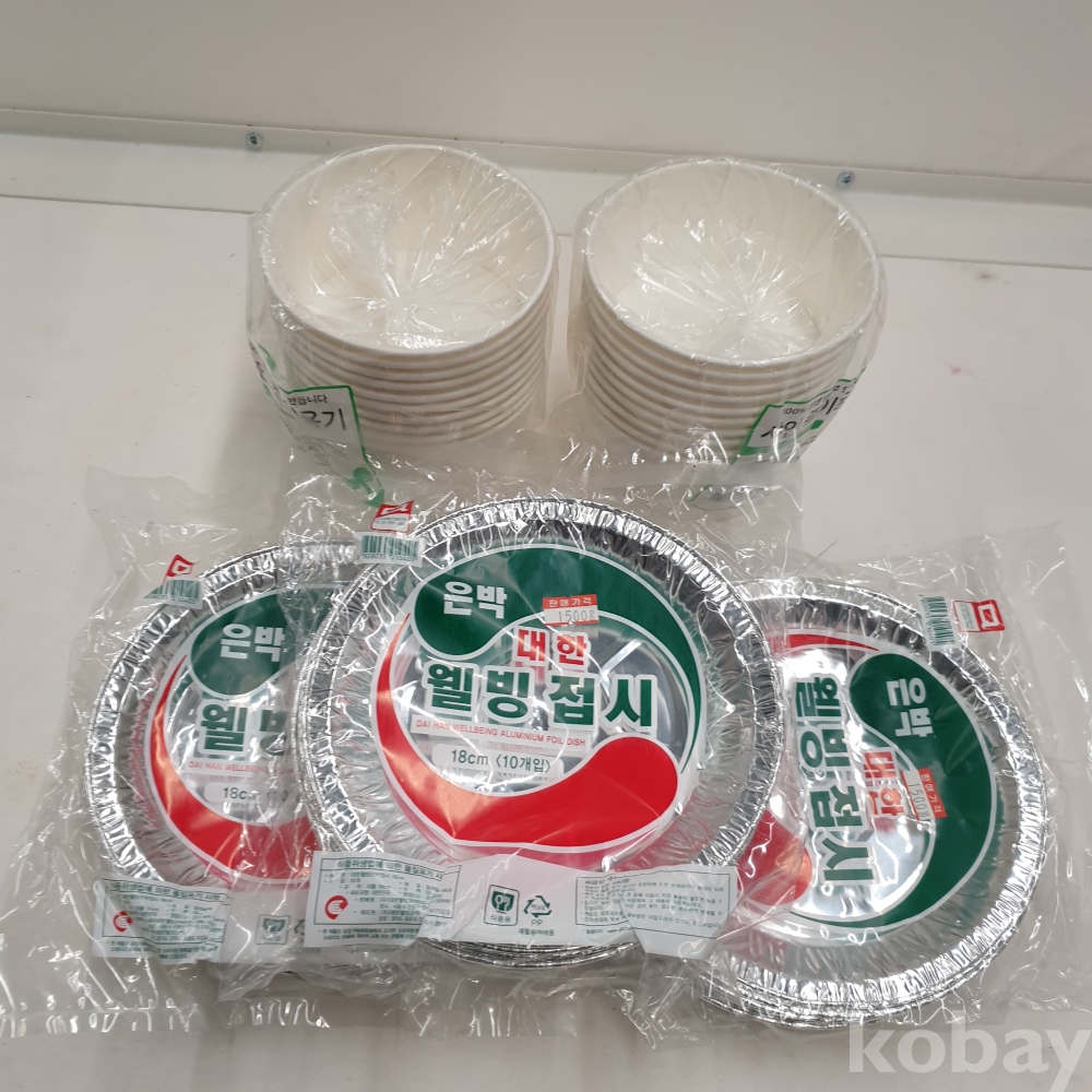 [*천원행복*] J - 4 - 0057 은박 일회용 접시 3개 (10개입 3개 , 18cm,미개봉) , 종이 용기 2개 (10개입 2개, 520ml, 미사용)