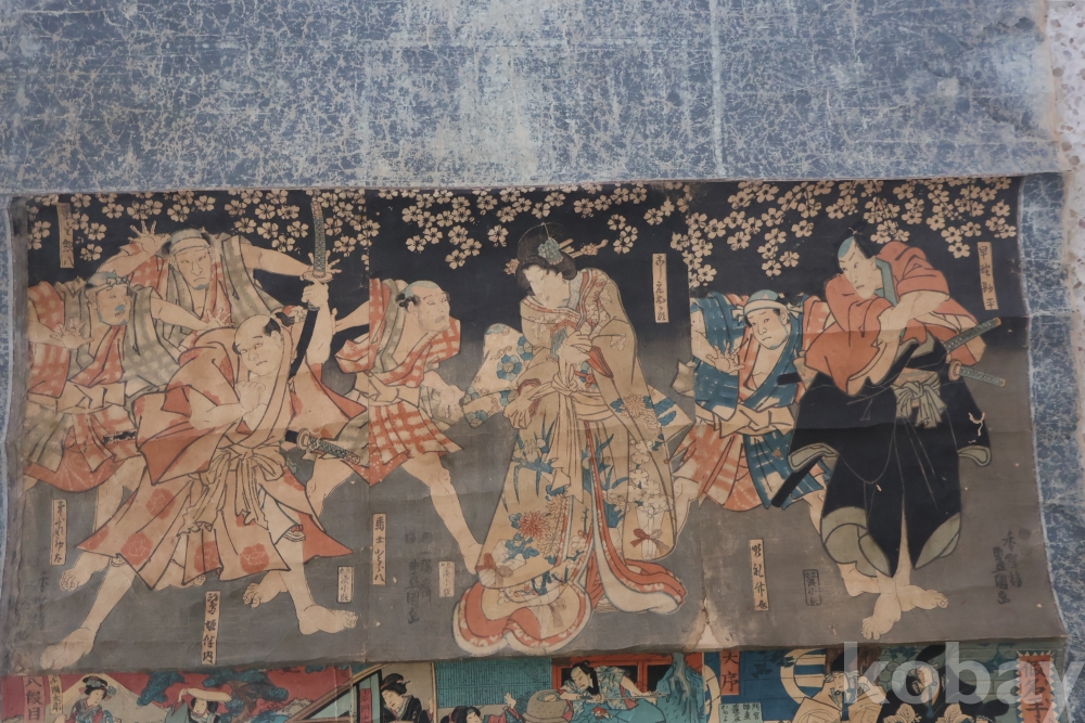 19세기 우키오에 목판화 3 세트 이며 오리지날 족자를 가진 명품 임니다 족자는 세월의 흔적이 보이는 대형 족자 임니다 당대 유명 화가의 원본 목판화 임니다