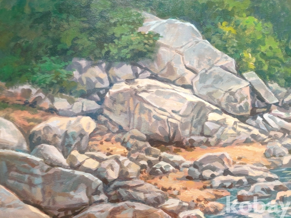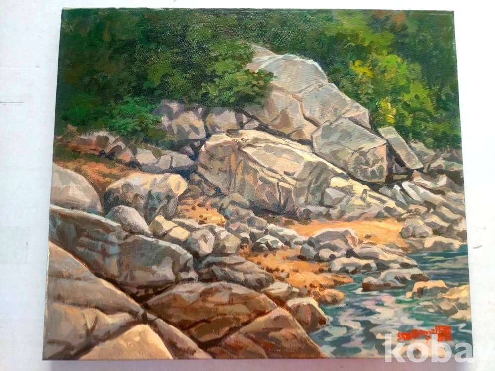 작품 설명: 전경에는 바위와 자갈이 깔린 계류가 흐르며 화면 하단을 구성하고 있고, 중경에는 큰 암석과 수목이 배치돼 화면의 중심을 형성하고 있다. 수목 뒤로는 녹색 계열의 숲이 이어지며 공간의 깊이를 더하고 있다. 인천 영종도 인근 용유도 을왕리 일대 풍경을 바탕으로, 물의 흐름과 암석의 명암 대비가 어우러지며 자연의 질감과 구조가 안정적으로 표현돼 있다.