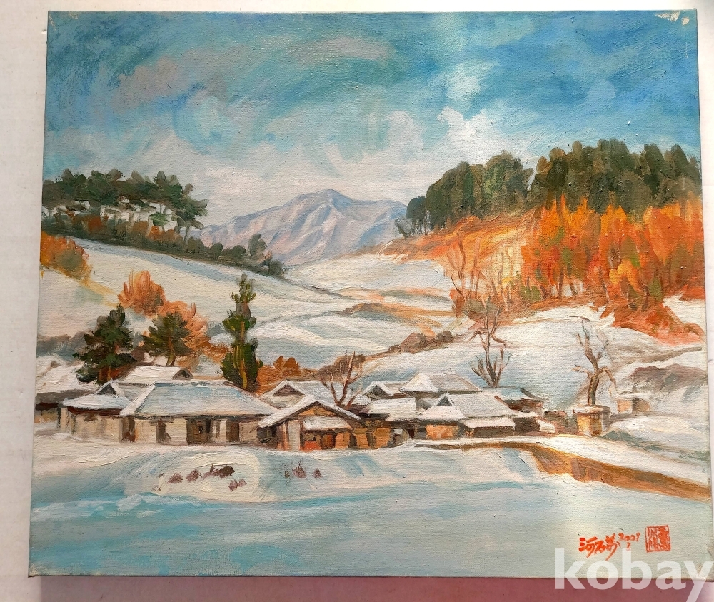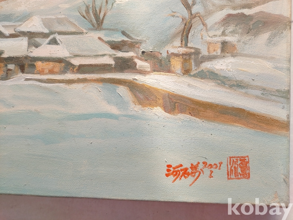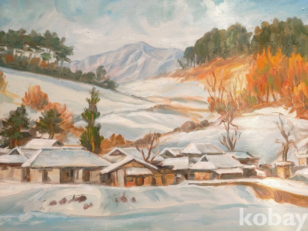 작품 설명: 화면 전경에는 눈이 쌓인 한옥과 마을 풍경이 낮은 시점으로 배치돼 있으며, 중경에는 완만한 구릉과 수목이 이어진다. 우측에는 붉은 색조의 수목 군락이 대비를 이루고, 후경에는 산세가 완만하게 이어지며 공간 깊이를 형성하고 있다. 설경의 밝은 색면과 따뜻한 색조의 대비가 화면 전반에 균형 있게 구성돼 있다.