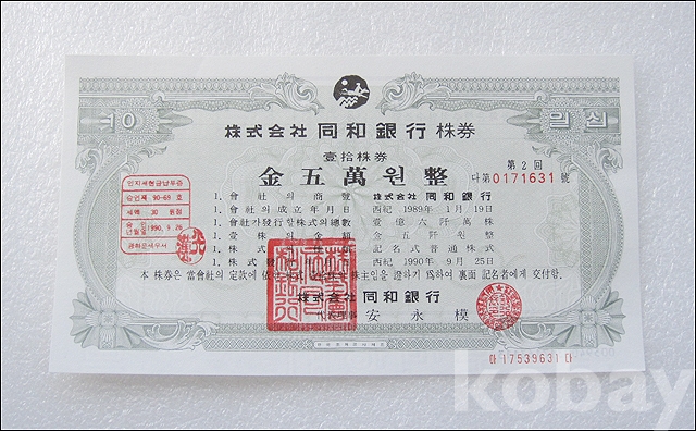 동화은행 50,000원 실물 종이 주식 (813)