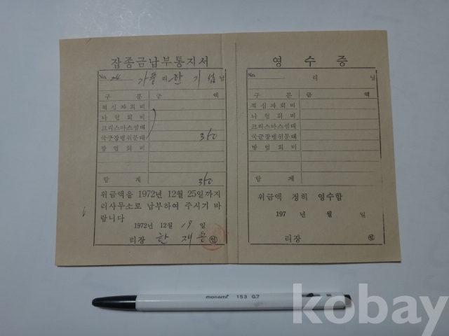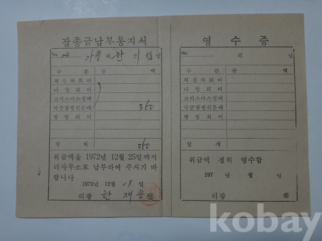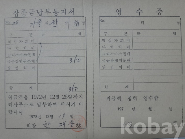 적십자회비. 나협회비, 크리스마스씰대, 국군장병위문대 등 - 잡종금 납부통지서 (1972년, 가풍리장)