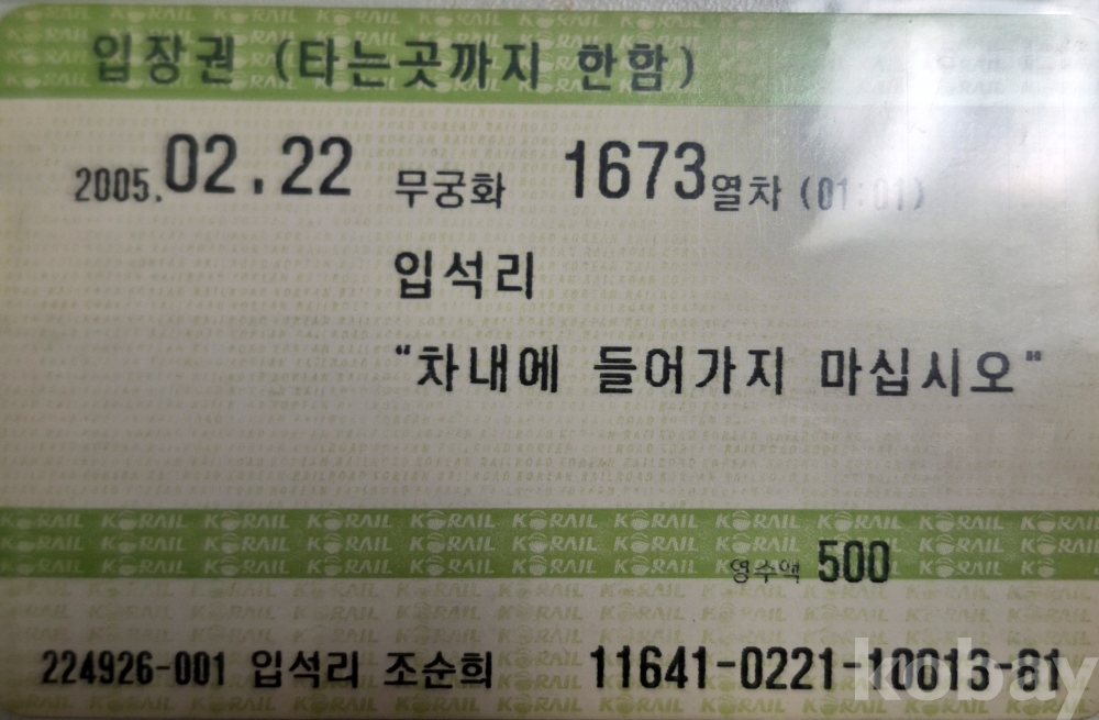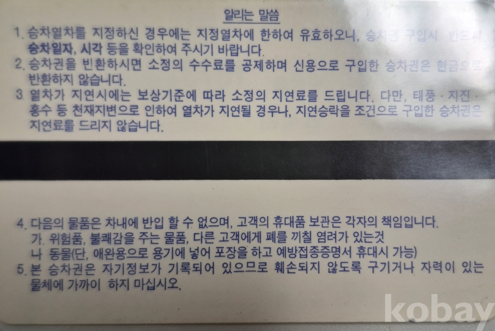 2009년 11월 30일 이전에 발행된 철도 MS(마그네틱) 단말기 입석리역 입장권입니다.