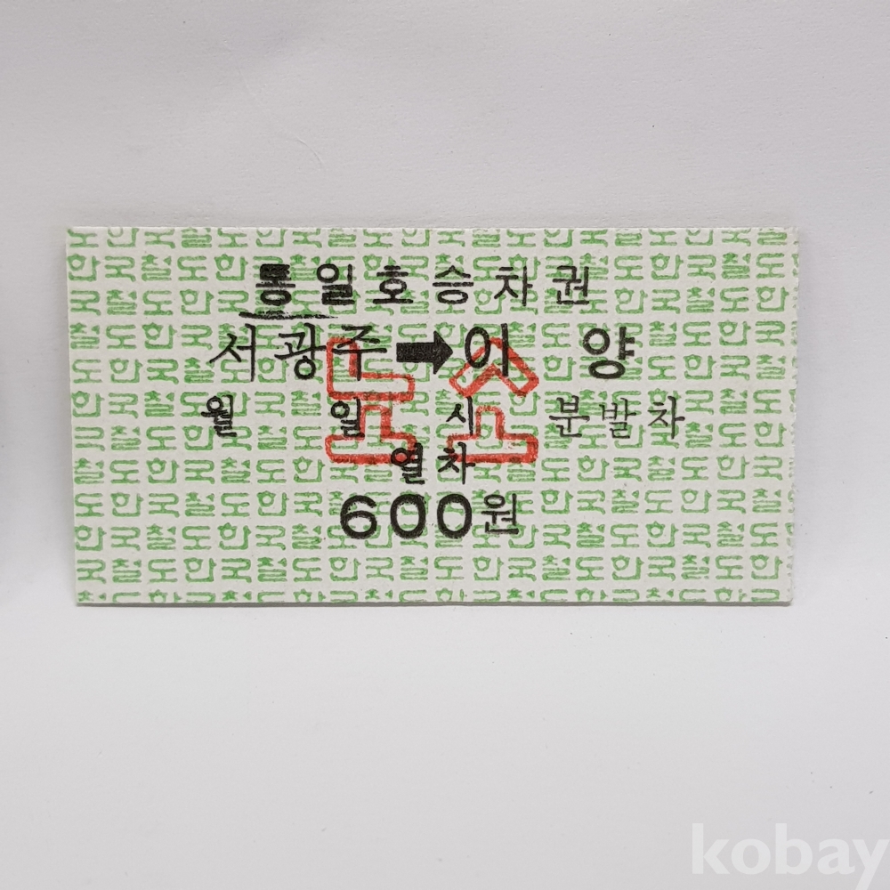 - " 서광주 ▶ 이양 " 미사용 통일호 승차권 노소 600원
