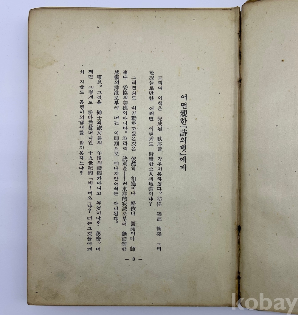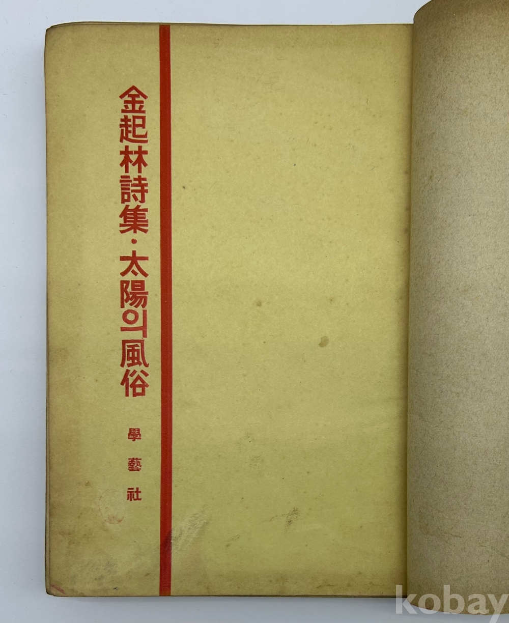 설 명 | 1939년 학예사(學藝社)에서 발행한 김기림 시집으로, 두 가지 판본이 존재한다. 하나는 장정이 없는 문고판이며, 다른 하나는 조선미술전람회 특선에 오른 김만형(金晩炯)의 장정이 적용된 양장본이다. 본 출품물은 김만형의 장정이 있는 양장본에 해당한다. ‘어떤 친한 시의 벗에게’라는 작자의 서문과 함께, 총 92편의 시가 6부로 나누어 수록되어 있다. 수록된 시들은 1930년 가을부터 1934년 가을 사이에 창작된 작품들이다. | |||||