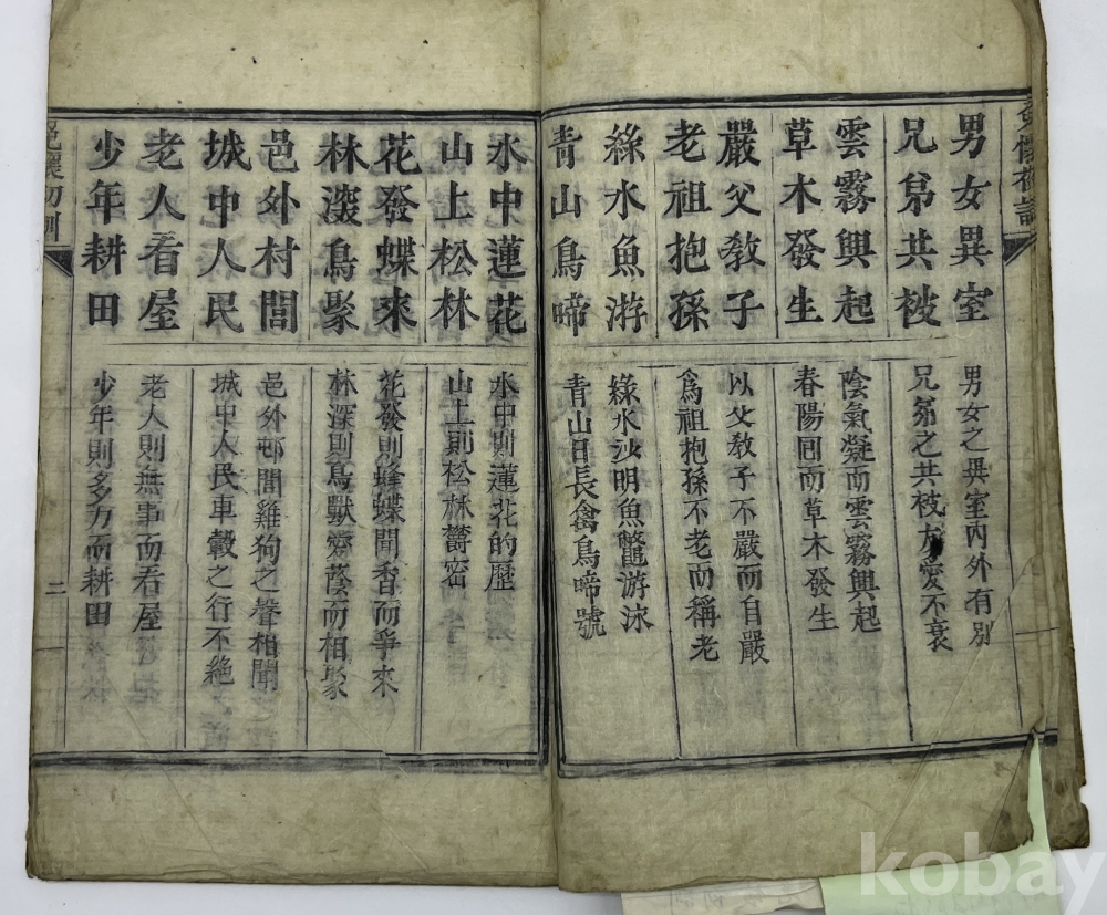 설 명 | 서문을 보면 천자문은 첩자(疊字)가 없어 초학 교재로는 적합하지 않아 자신이 아이들이 보고들은 사물 위주로 4자의 상담(常談)을 만들어 애써 괴벽한 것을 피하고 일부러 첩자로 만들었다고 한다. 말미 간기의 저자 주소는 청북 보은군 회남면 전곡리이며 인쇄소는 청주군 현도면 달계리에 소재한 풍림정사(風林精舍)이다. | |||||