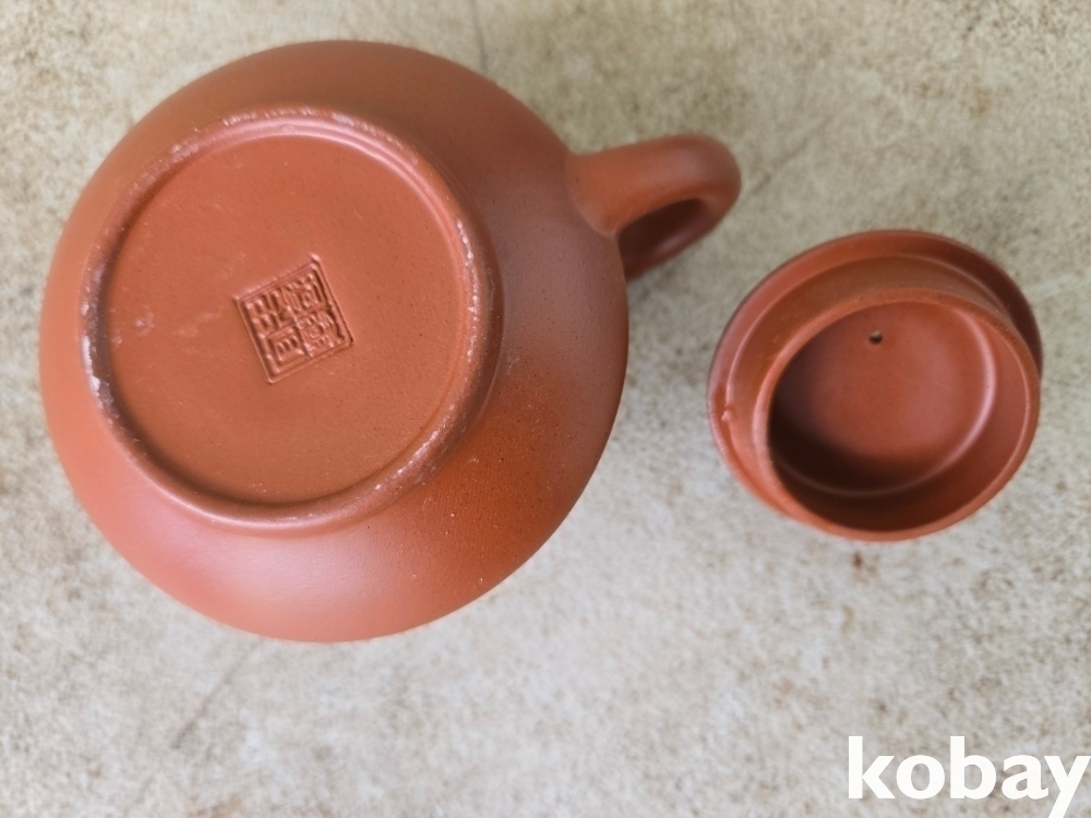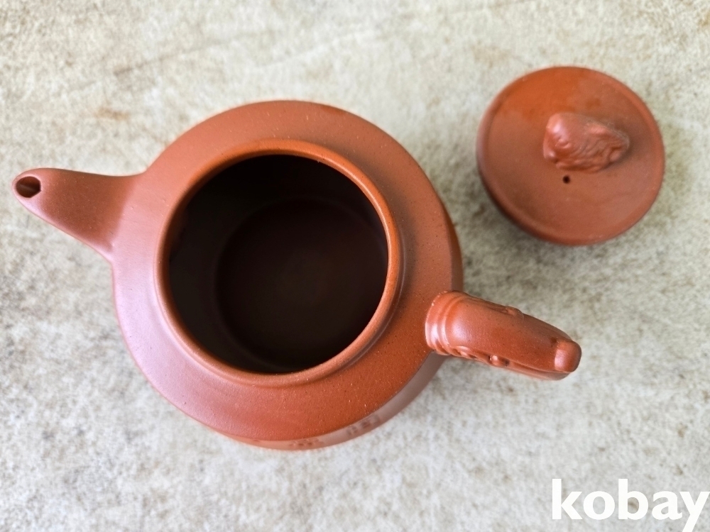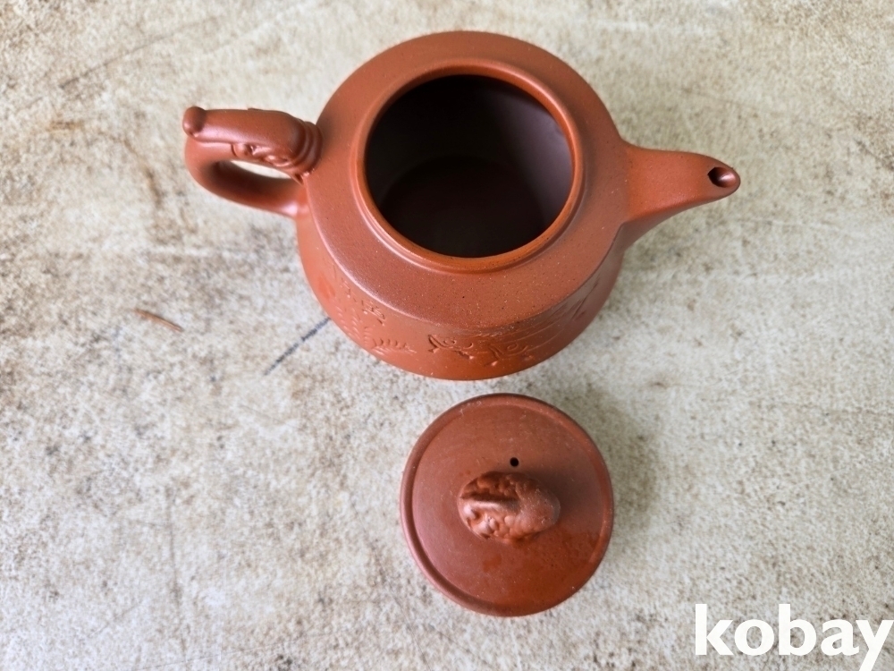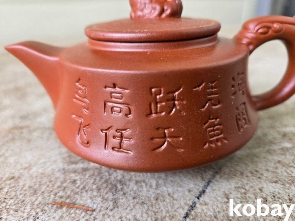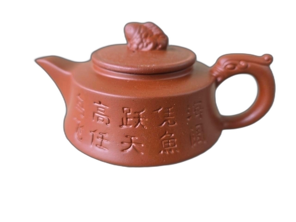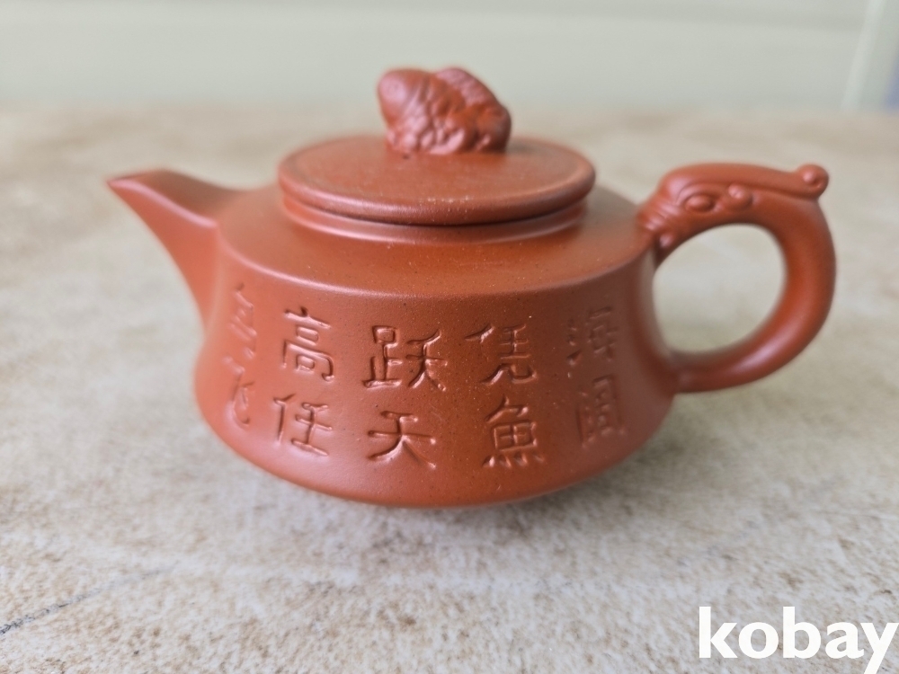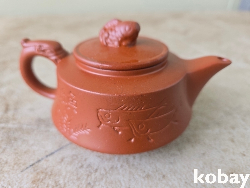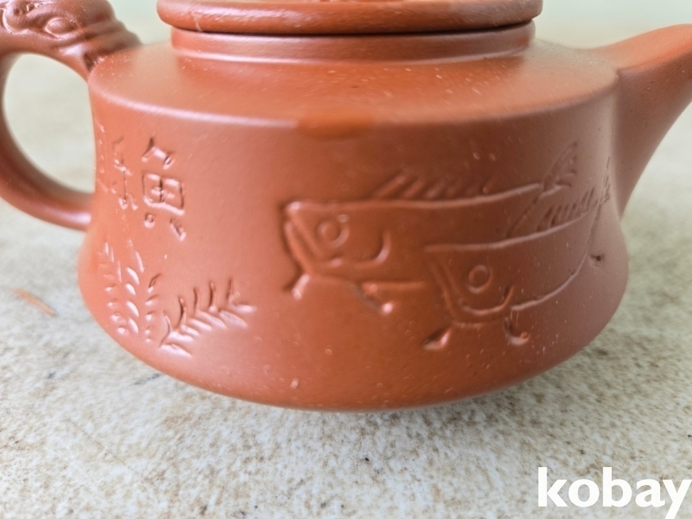 글씨와 물고기 문양이 음각되어 있는 자사 주전자 도자기 입니다.