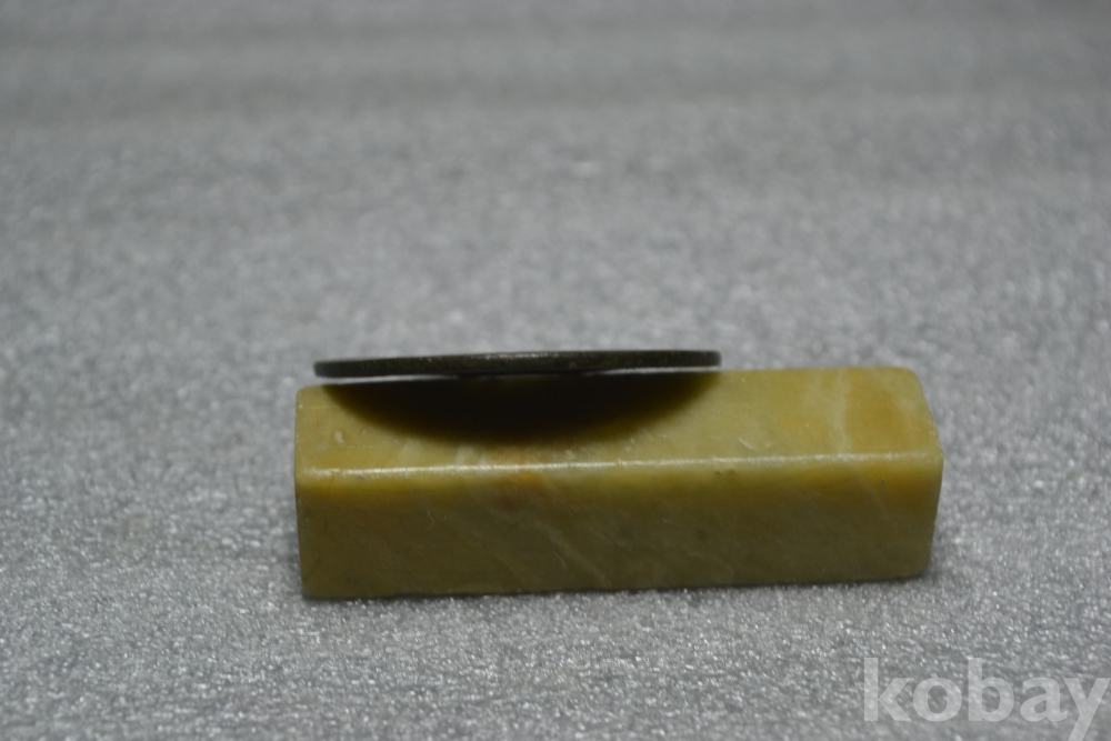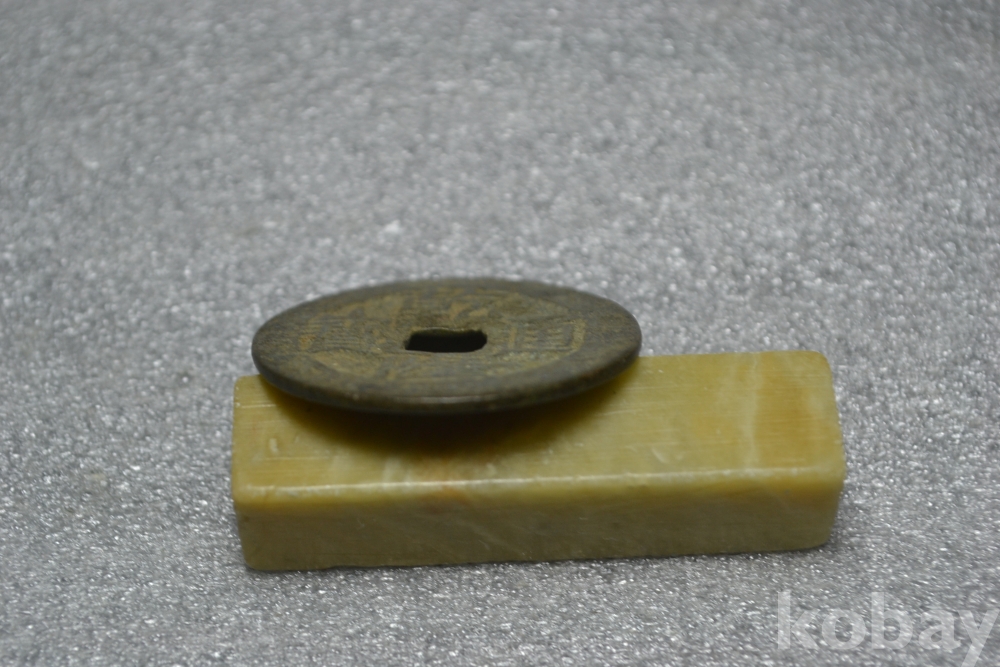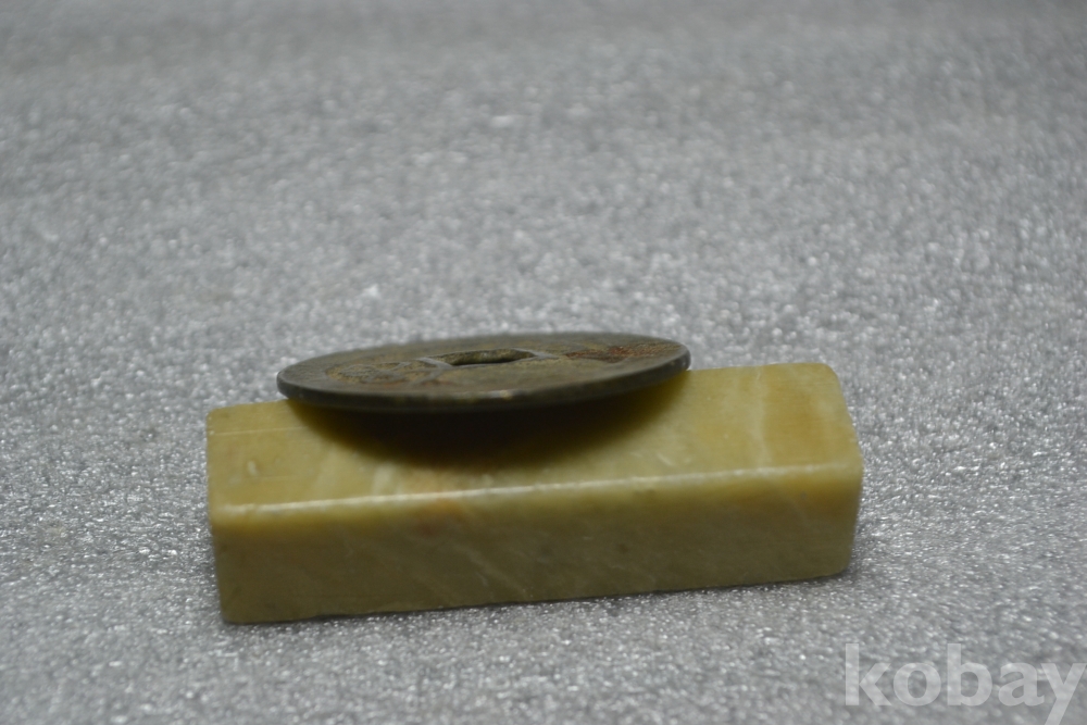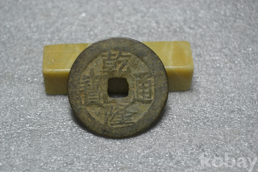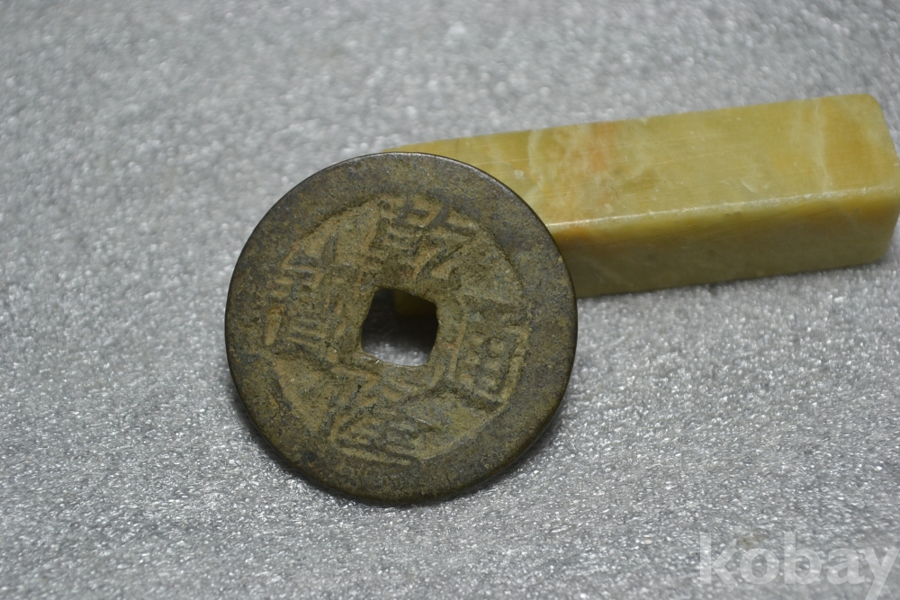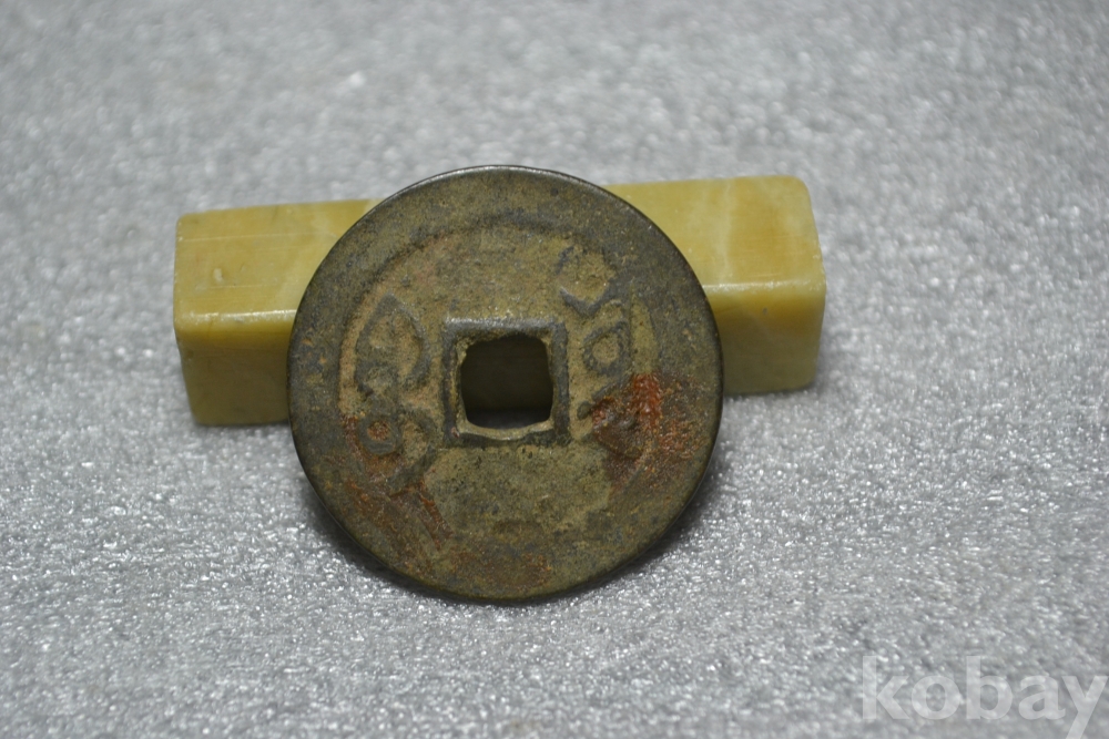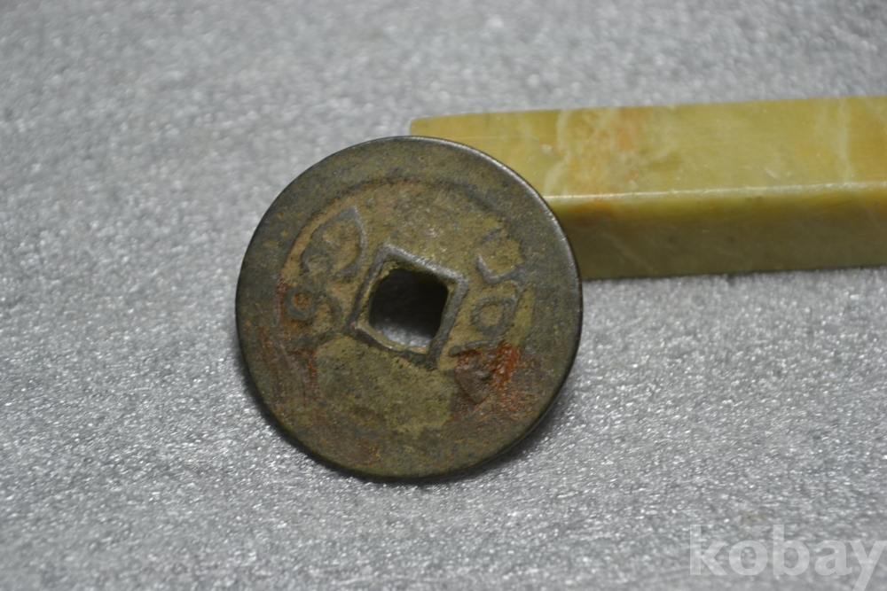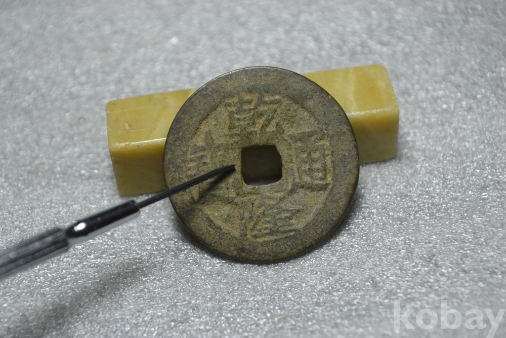 엽전의 가운데 사각형 구멍 주위가 작은 눌림 휘어짐이 있습니다. (검은핀으로 가르킨 부분 사진참조)