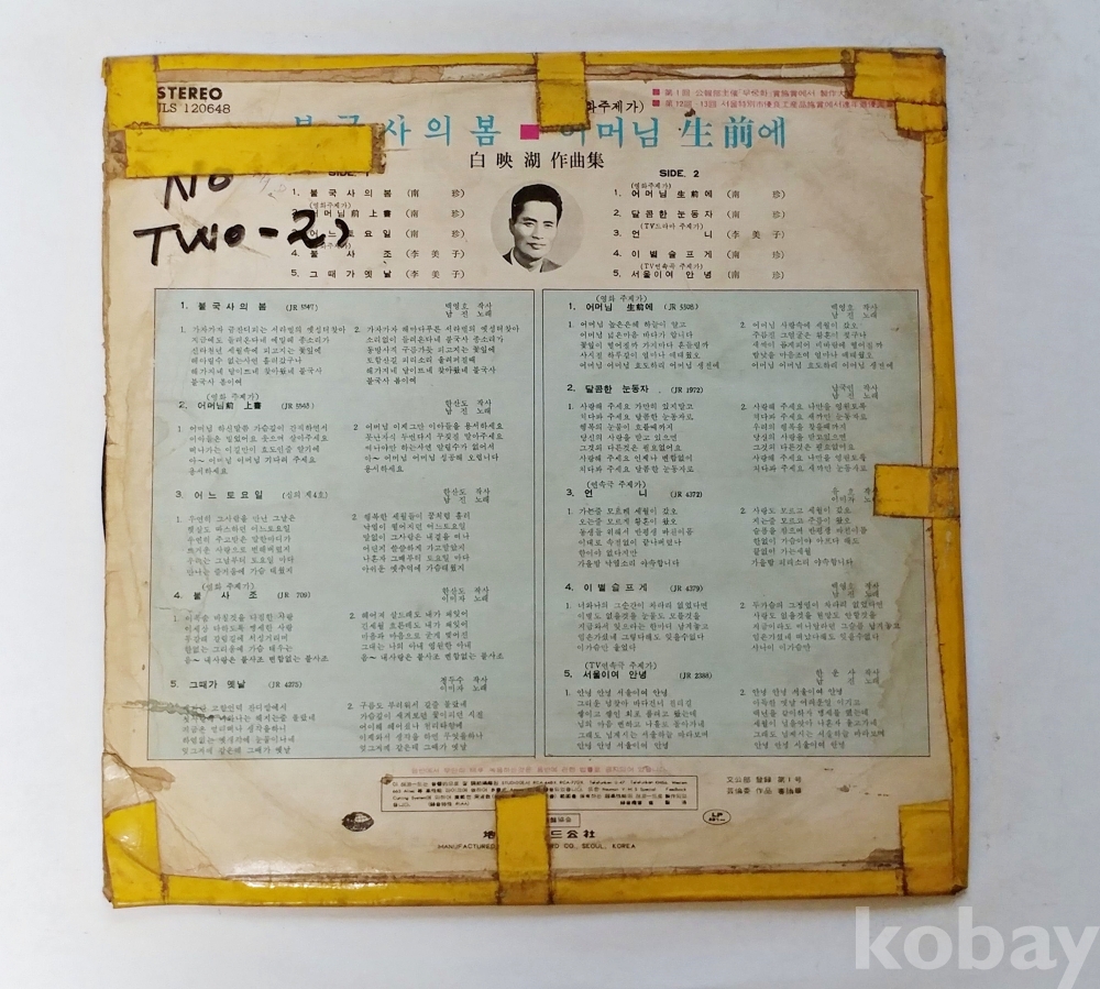 | 자켓상태 | VG : 주름, 접힘, 모서리 찢김 다수 | 음반상태 | EX : 재생에 영향 없는 가벼운 기스 존재 | 발매정보 | 알수없음 | 가사지여부 | 무 |