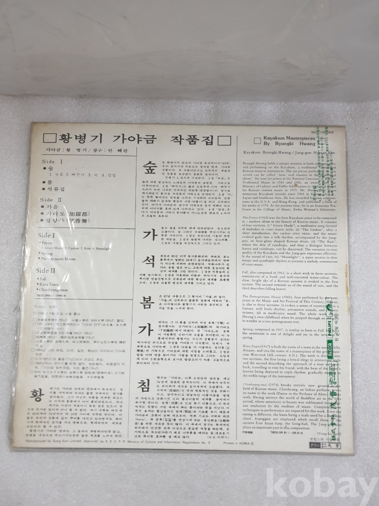 {천원경매}4-0757 황병기 가야금 작품집 LP (깨질 위험이 있으니 LP끼리만 합배송 바랍니다.)
