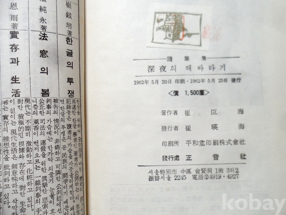 1962년 심야의 해바라기 최신해 정음사 초판