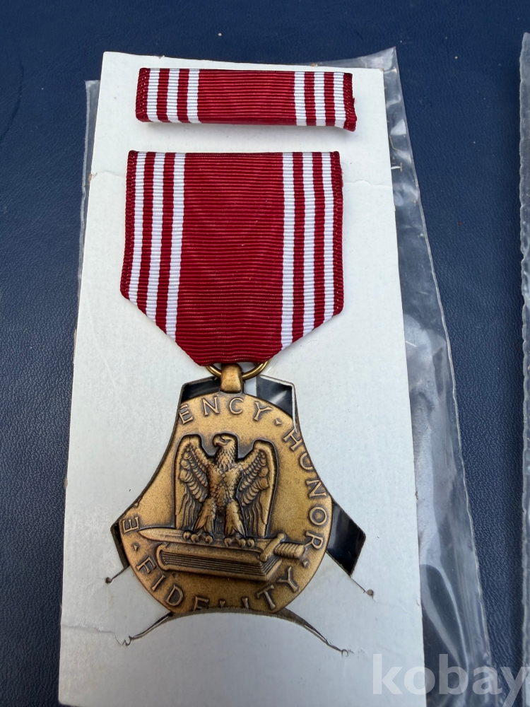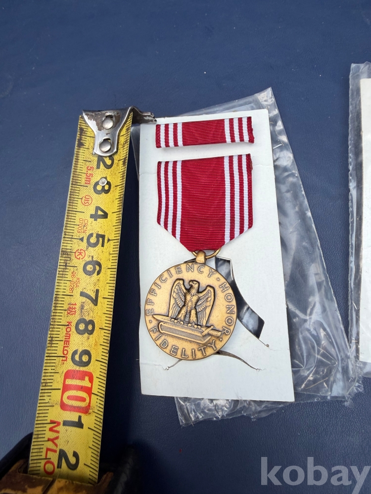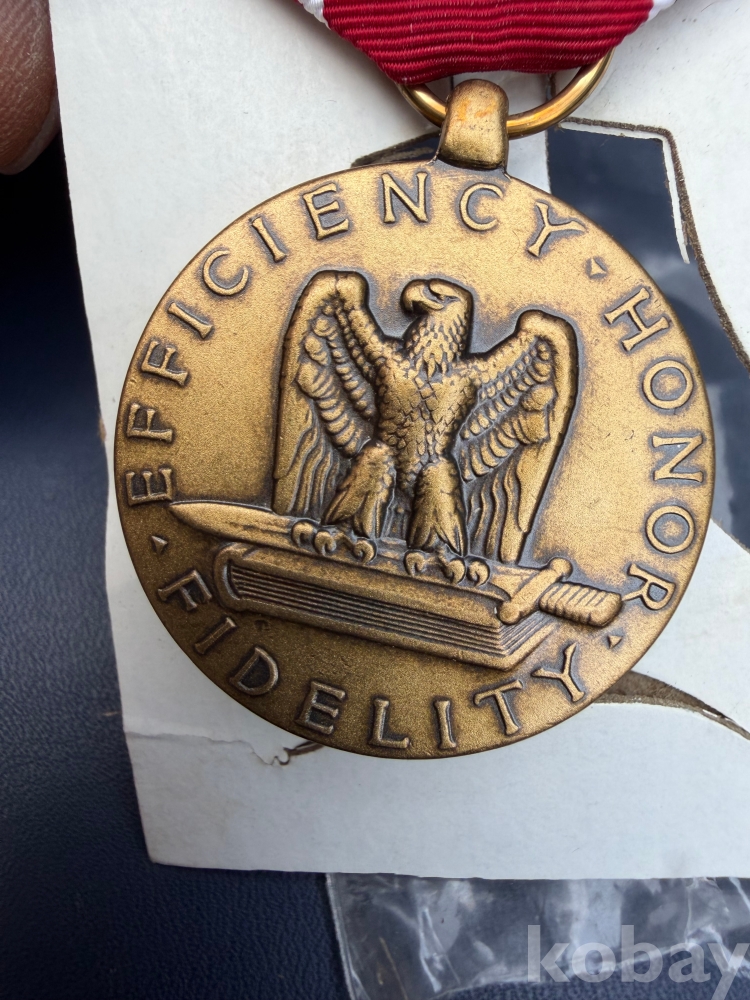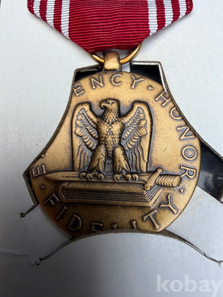 • 디자인: 메달 정면에 독수리가 날개를 펼치고 칼과 책 위에 서 있는 모습이 새겨져 있으며, 가장자리에는 **"EFFICIENCY(능률), HONOR(명예), FIDELITY(충성)"**라는 문구가 적혀 있습니다.