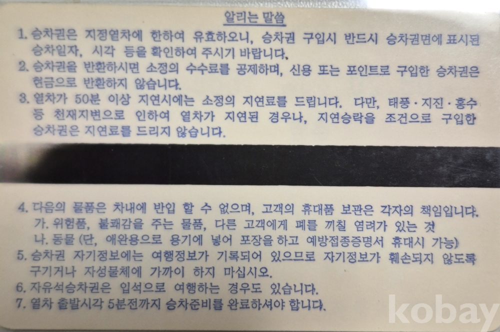2009년 11월 30일 이전에 발행된 철도 MS(마그네틱) 단말기 춘양역 입장권입니다.