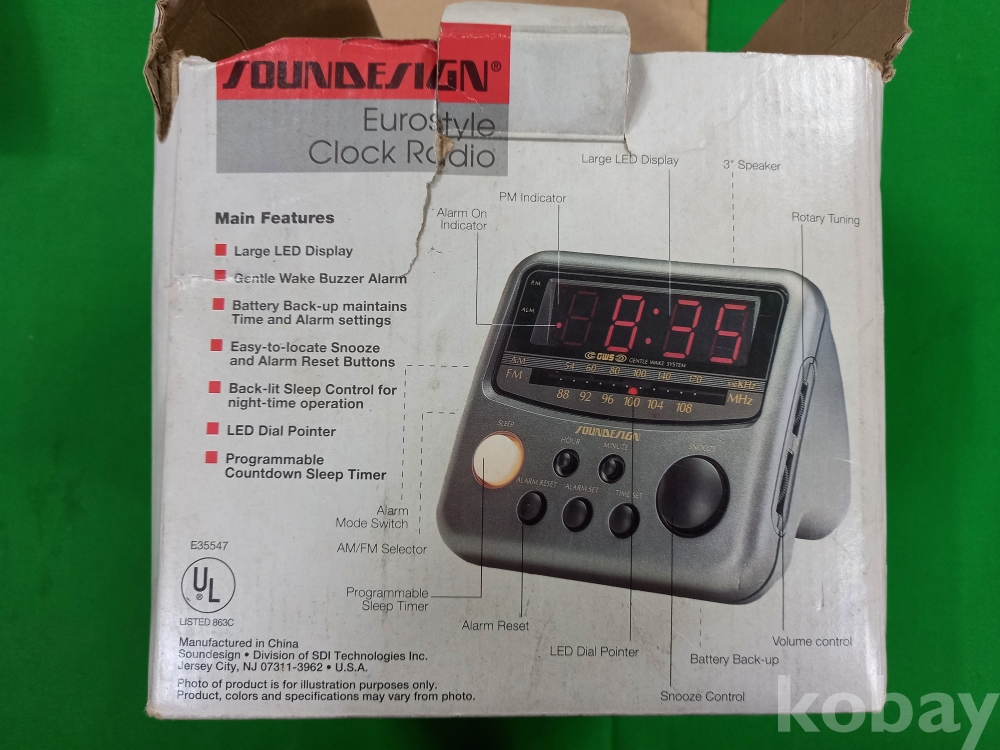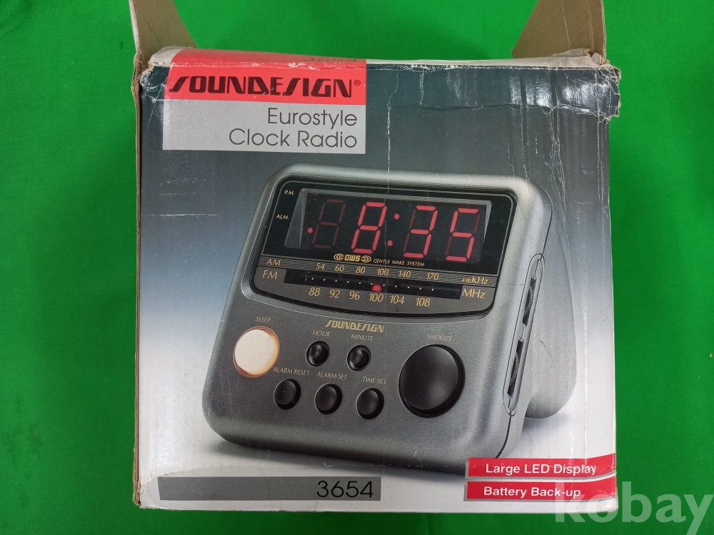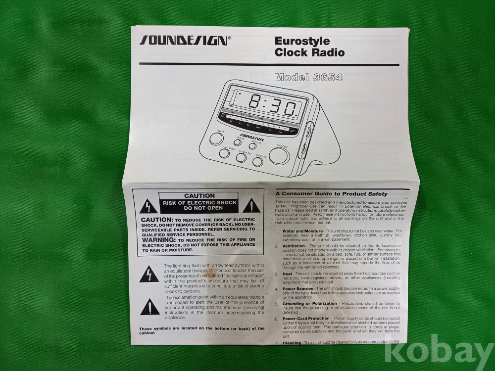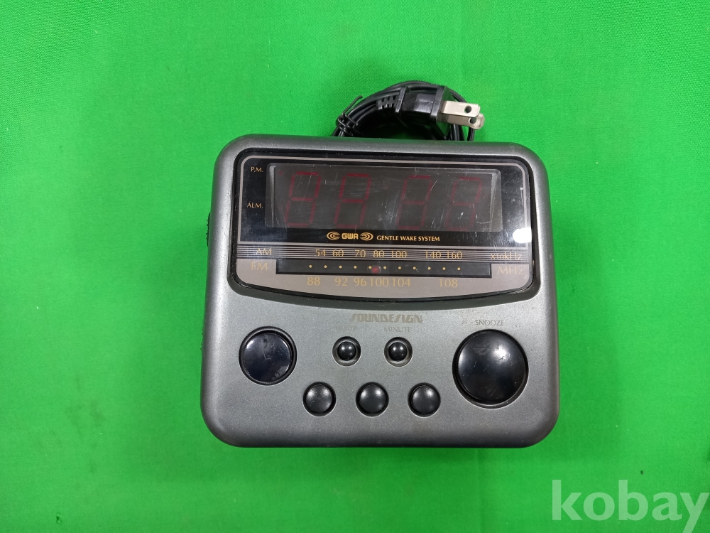 이 제품은 Soundesign 브랜드의 GWA 3654 MCL 모델로, Gentle Wake System 기능이 포함된 AM/FM 라디오 알람 시계입니다. 1980년대 후반에서 1990년대에 출시된 빈티지 전자제품으로, 설정값 저장을 위해 9볼트 배터리를 백업용으로 사용합니다.