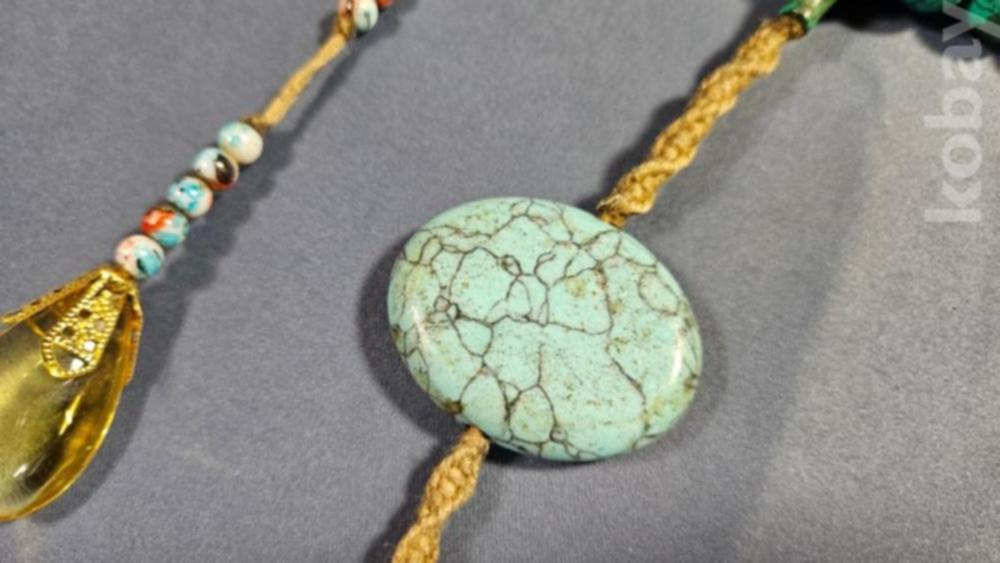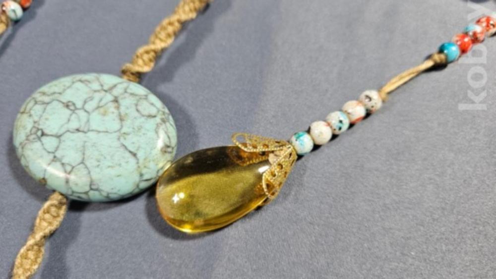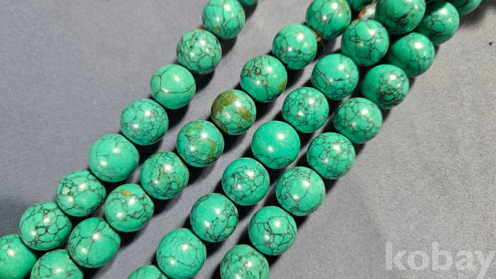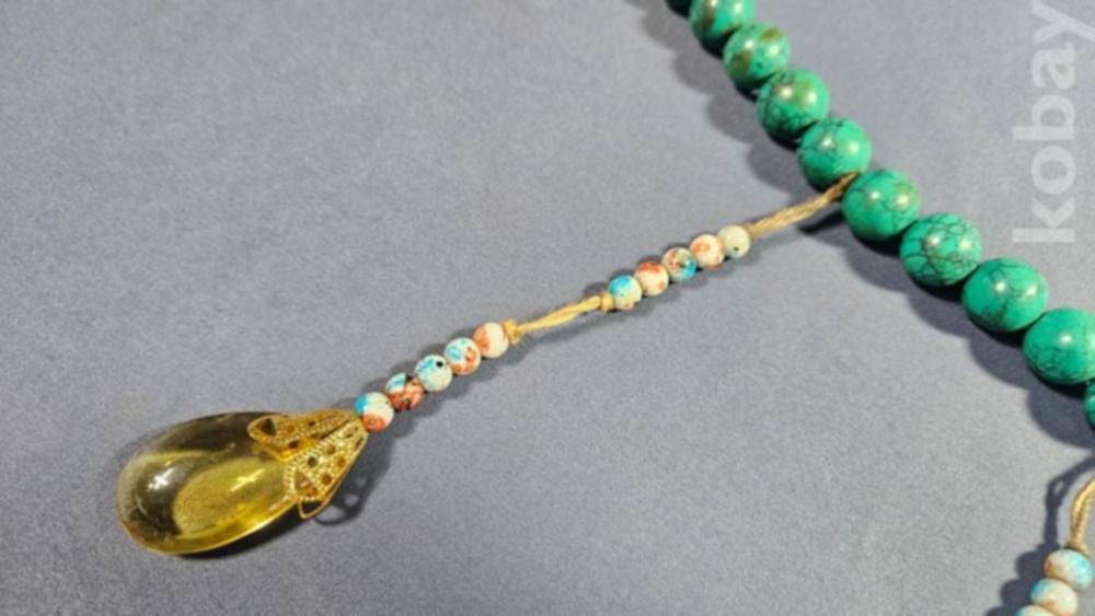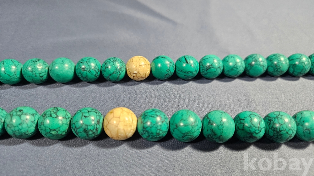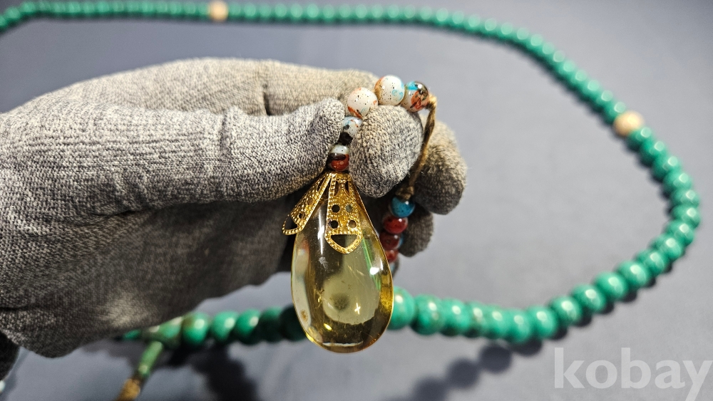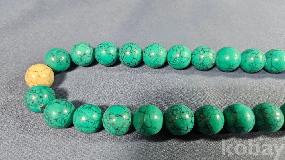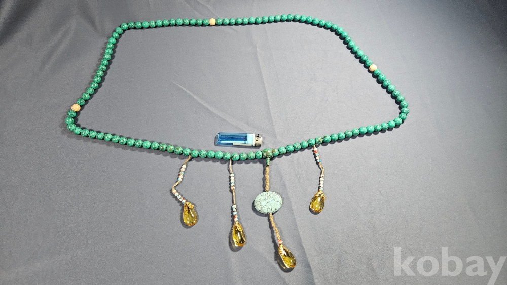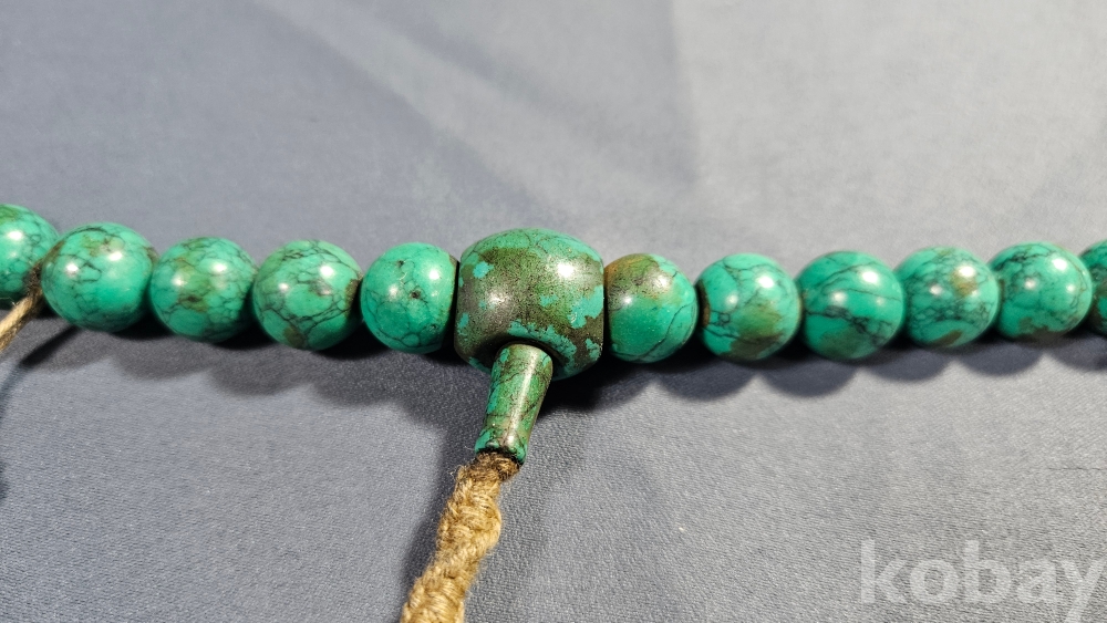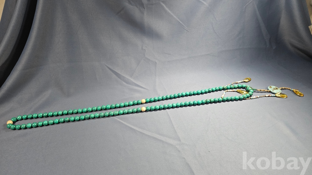 터키석 색이 나는 기다란 염주목걸이 입니다.