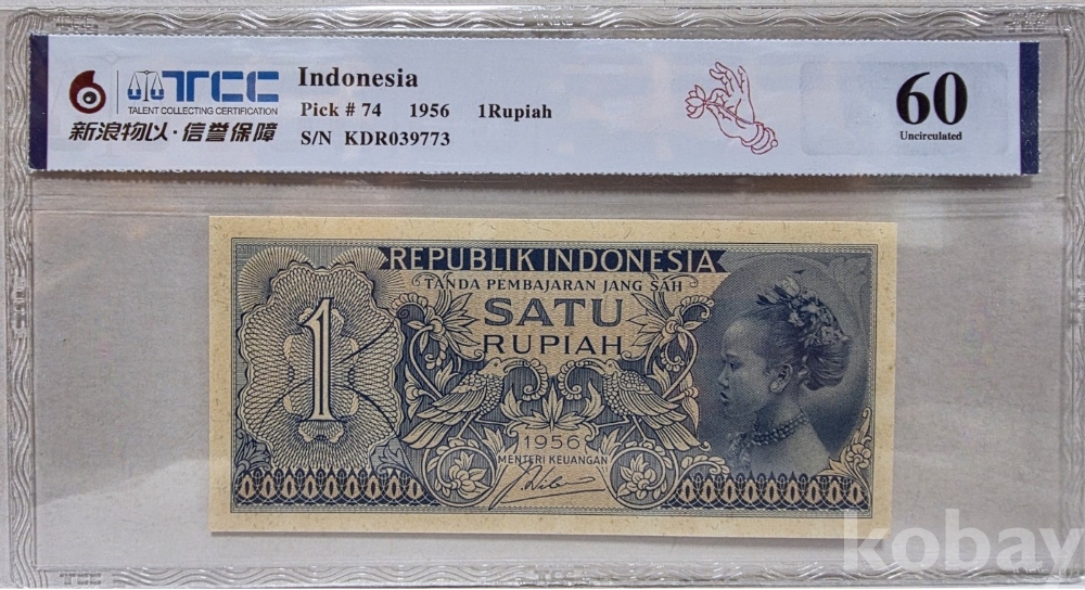 -1956년 인도네시아 1루피아 지폐 TCC60 등급 입니다.