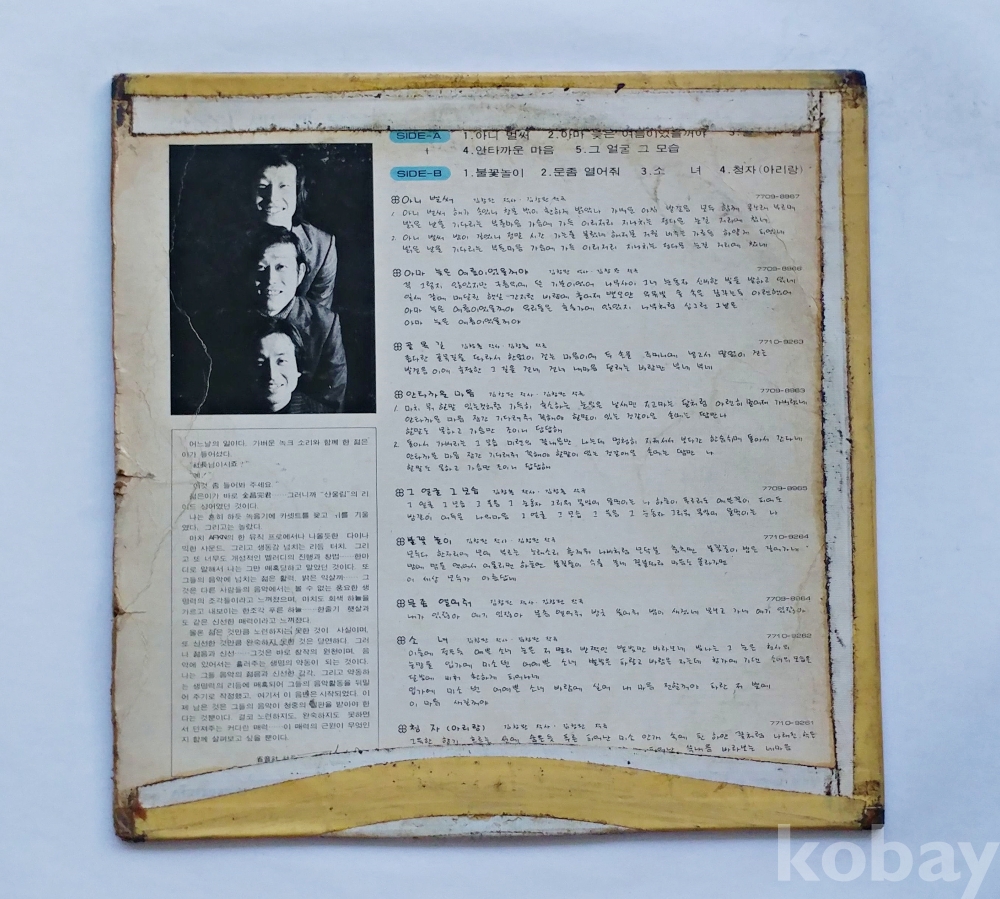 | 자켓상태 | VG : 주름, 접힘, 모서리 찢김 다수 | 음반상태 | EX : 재생에 영향 없는 가벼운 기스 존재 | 발매정보 | 알수없음 | 가사지여부 | 무 |