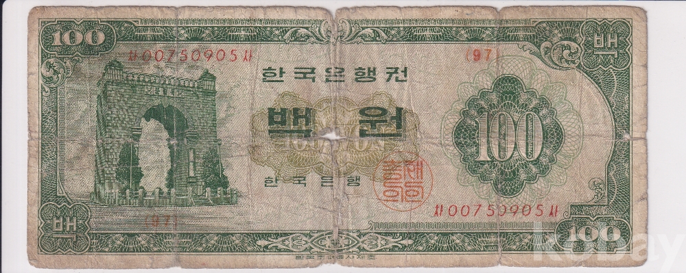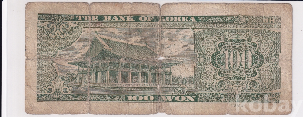 - 한국은행 1964년 경회루 백원 00표인트 사용제 지폐