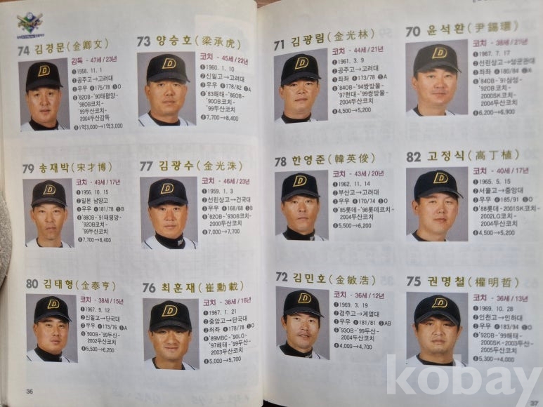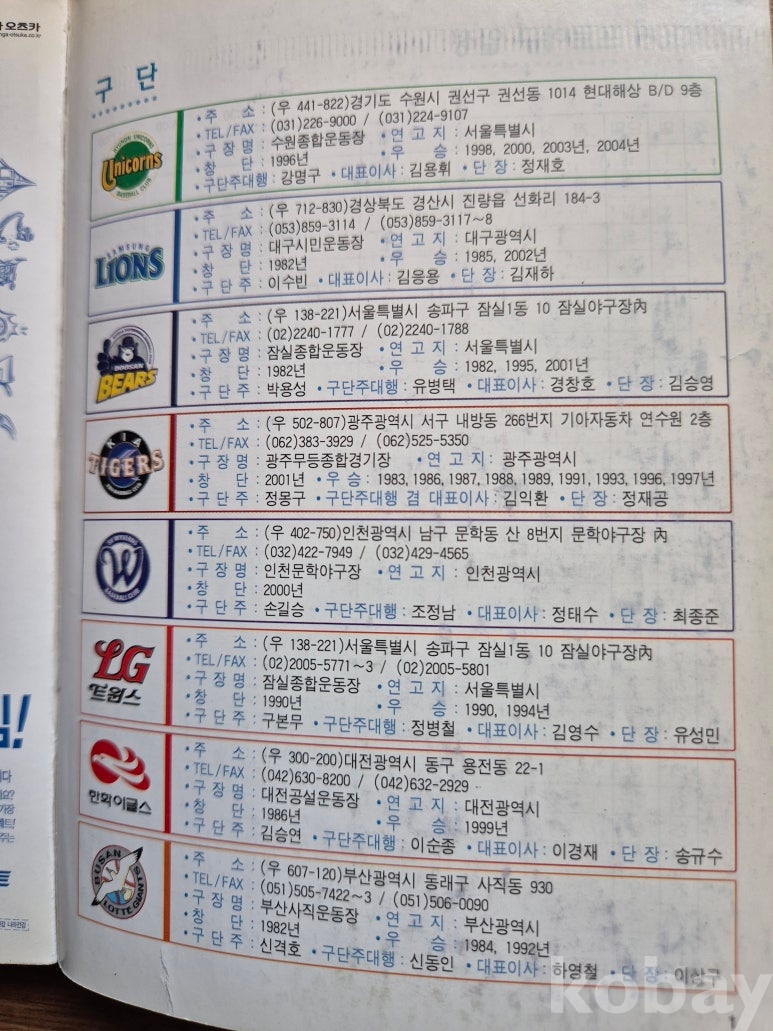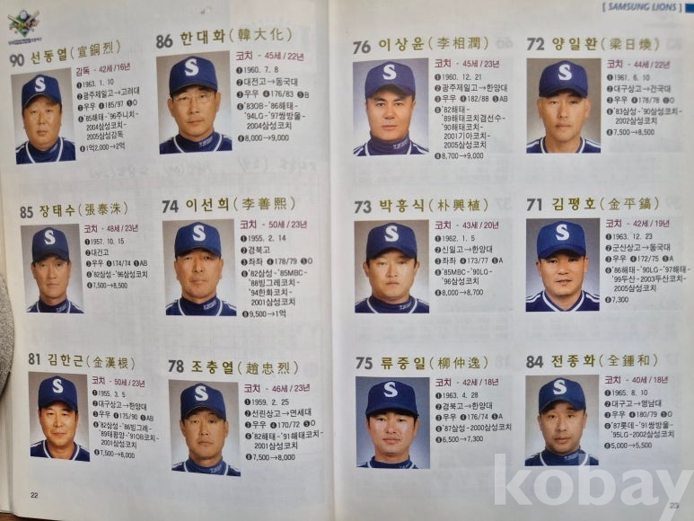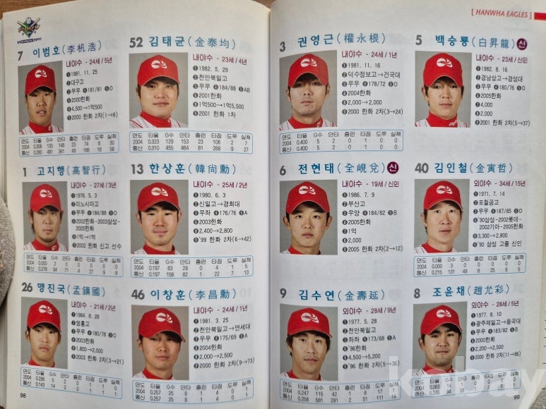 설명: 이 책의 오피셜 가이드북으로 속 내용에는 전 구단 선수 성명. 생년원일. 국적. 배번. 위치. 출신교. 투타. 신장/체중. 혈액형. 입단년도. 계약금. 년봉 등 등 기록 제공된 책입니다.