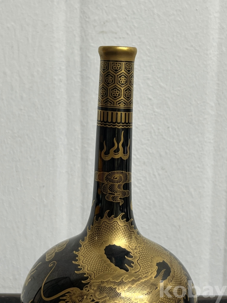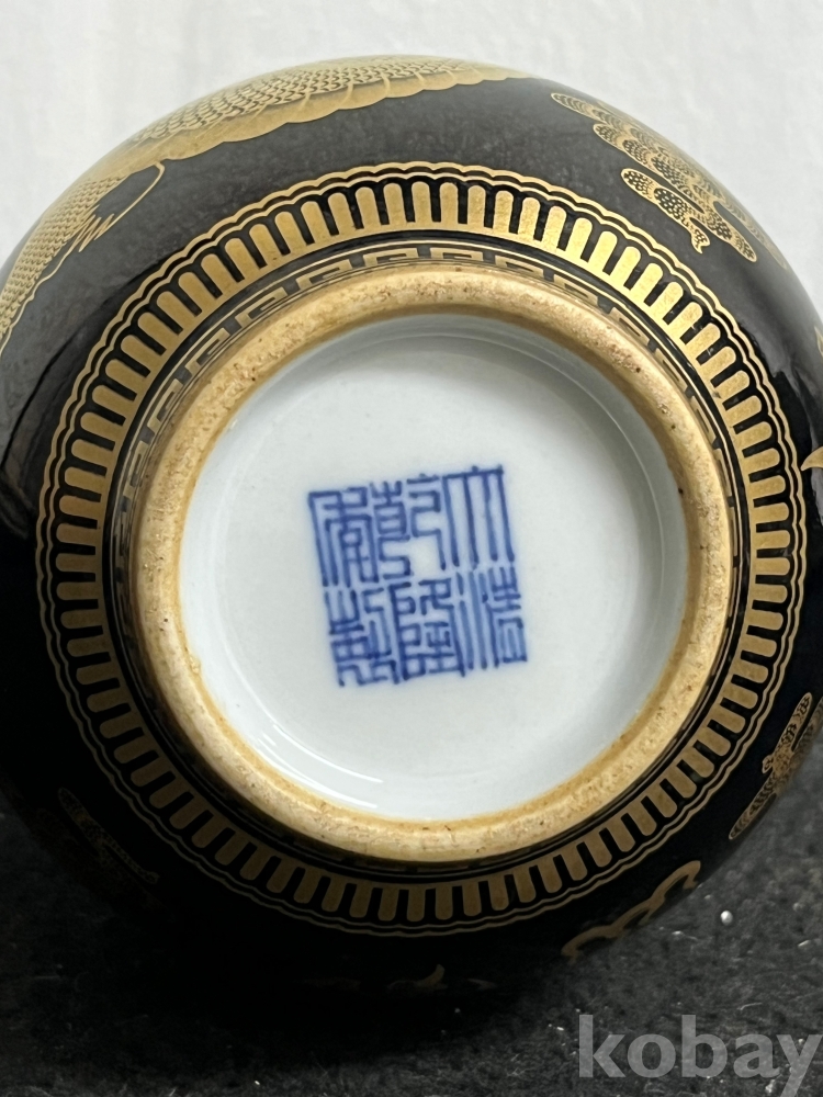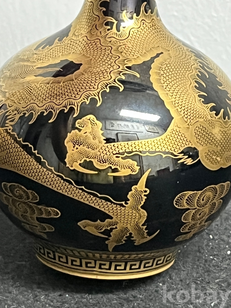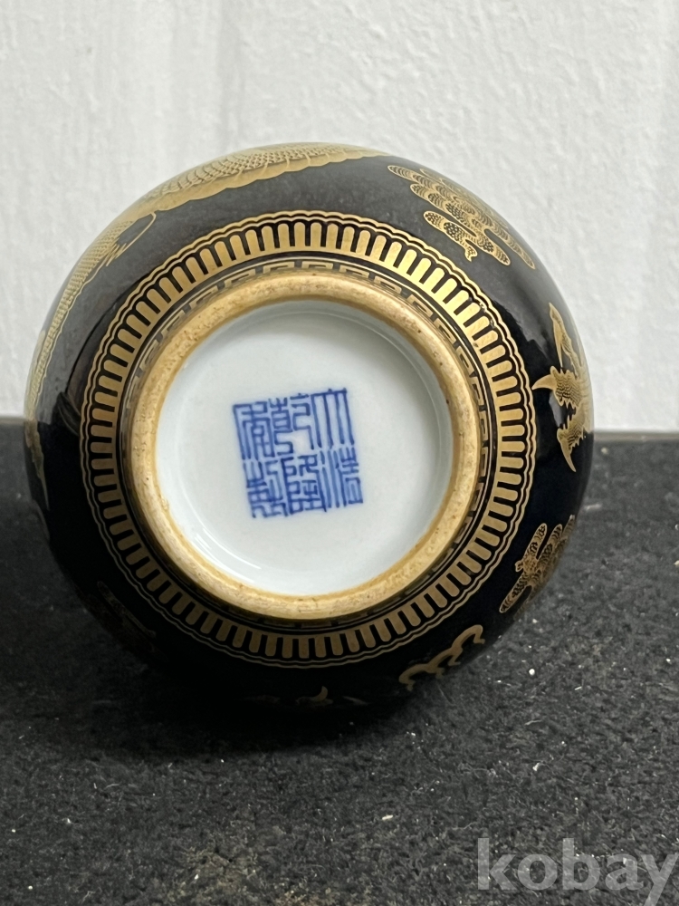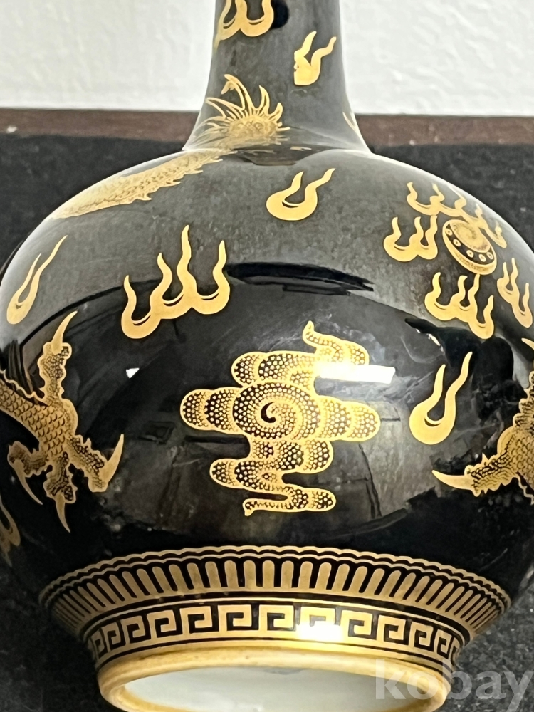 깊은 흑유 바탕 위에 금채로 용과 구름을 화려하게 시문한 작품입니다.