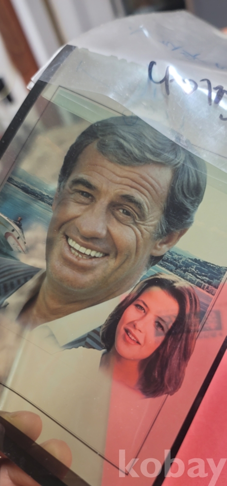 장 폴 벨몽도(Jean-Paul Belmondo): 프랑스의 전설적인 배우인 장 폴 벨몽도의 모습과 그의 사인이 인쇄된 필름도 보입니다. 이 사인은 필름 원판 제작 시 함께 인쇄된 '프린티드 사인'일 가능성이 높지만, 영화사 공식 홍보물이라는 증거가 되어 가치를 높여줍니다.