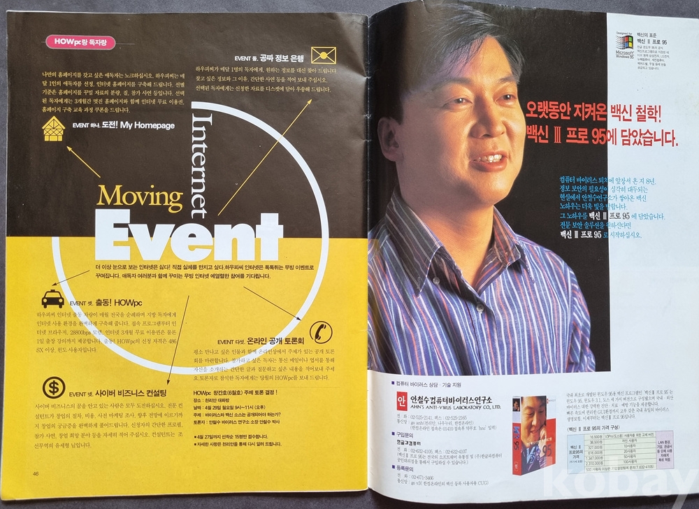 안철수 박사 리즈 시절 광고: '백신 III 프로 95' 광고 모델로 등장한 젊은 시절의 안철수 소장 수록.