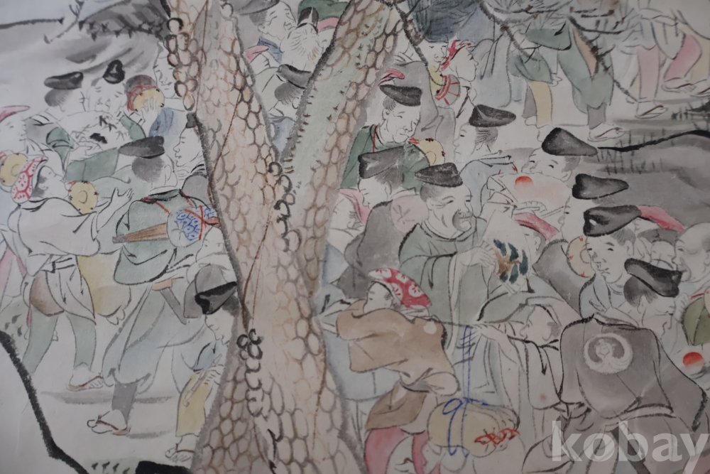 제작 년도 를 가진 대형 족자 임니다 수많은 사람이 보이는 당대의 명화 임니다 사진 참조 하세요 대정 14년 1925 낙기가 보임니다 족자 밑부분에 세월 흔적이 보임니다 6번사진